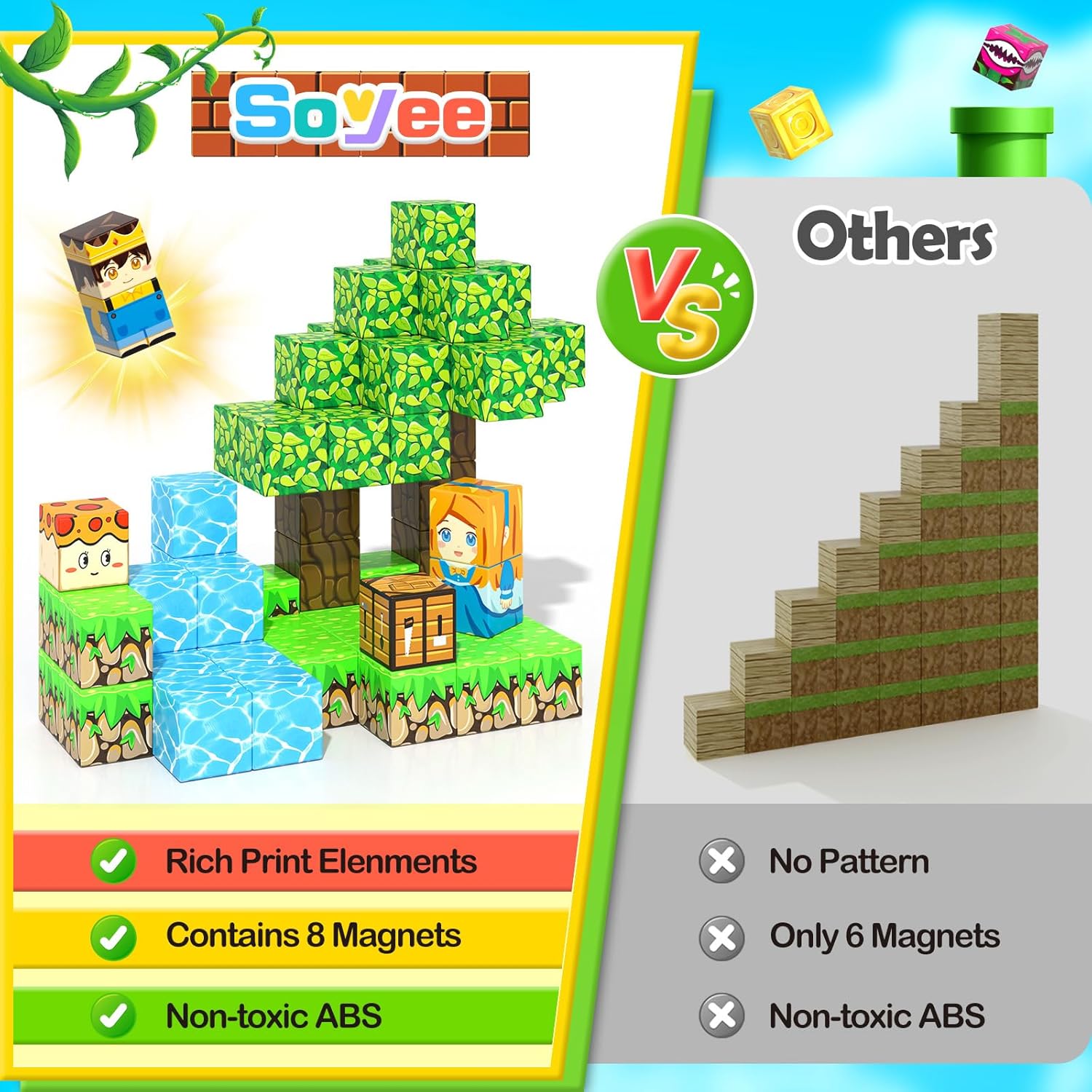 - QUALITY YOU CAN TRUST: SOYEE magnetic toys pay closer attention to the quality and playability of toys, including safe edges, UV printing, and suitable magnetism. The magnetic toys are made from ABS material and meet relevant kids toy standards and requirements. Magnetic sensory toys have no sharp edges, an 8-sided magnetic design, and powerful magnetism, Soyee magnetic kit is designed with a 1-inch size to effectively prevent toddlers from swallowing, ensuring kids have a safer and more enjoyable gaming experience