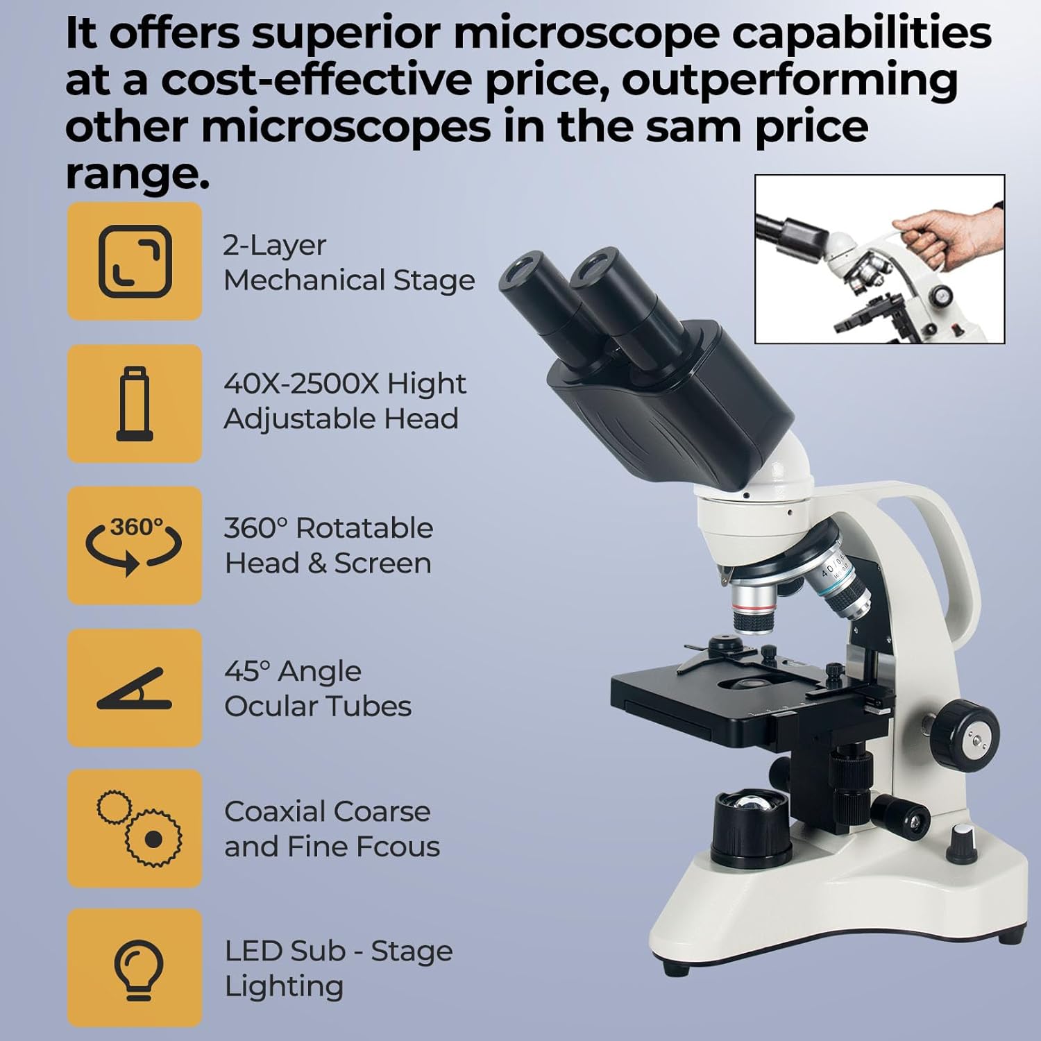- [Value Beyond Price]: This microscope is designed for students and budget-conscious adults. It offers superior microscope functionality at an affordable price, outperforming other microscopes in the same price range while delivering professional-grade configuration at entry-level costs. Although priced as competitively as entry-level models on the market, this microscope excels in both product quality and image clarity compared to standard entry-level microscopes. Key professional-grade features include: a double-layer stage (typically found in professional models), NA 1.25 Abbe condenser with iris diaphragm, along with both fine and coarse adjustment knobs.