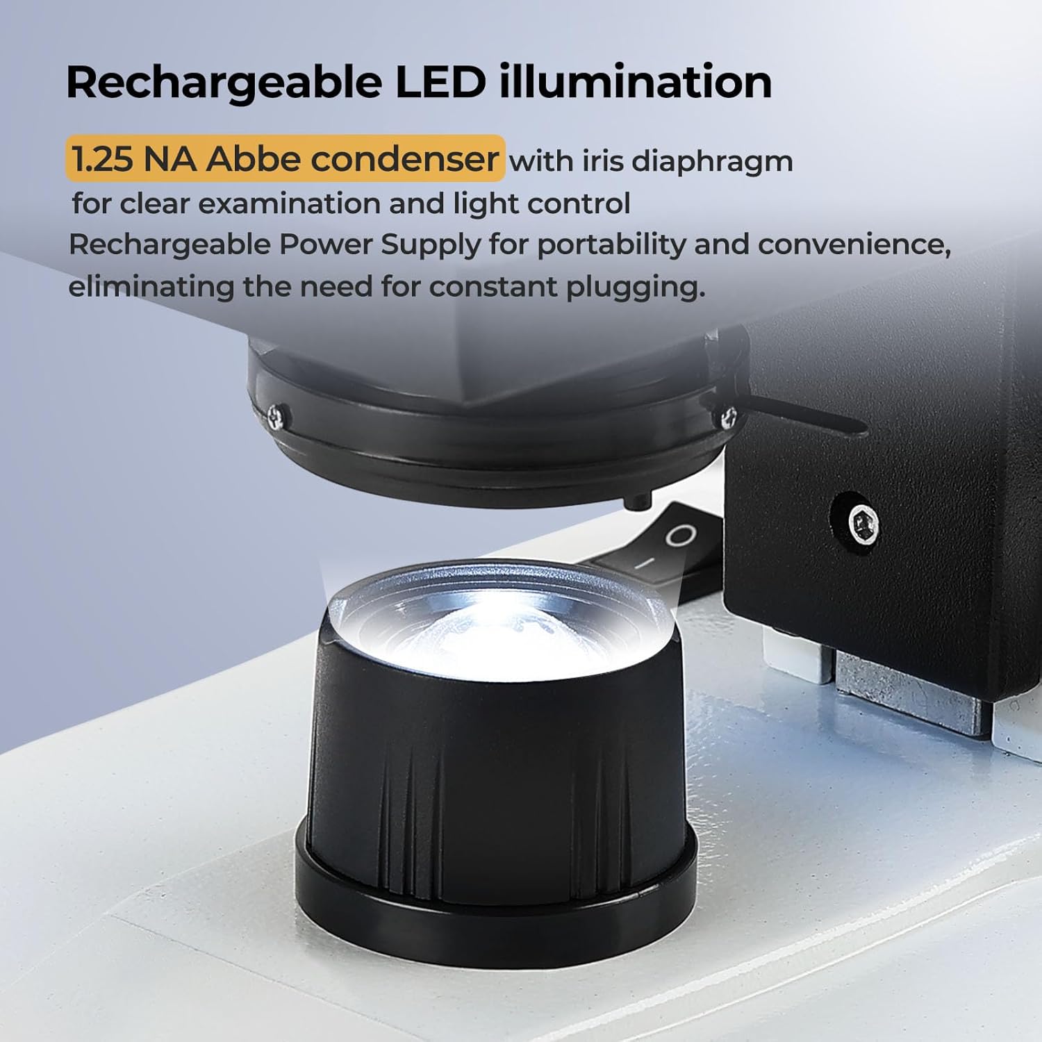 - [LED Light & Diaphragm]: Equipped with LED illumination for clear examination. The 1.25 NA Abbe condenser includes an iris diaphragm, allowing precise control over the light and enhancing the examination experience. Rechargeable Power Supply for portability and convenience,eliminating the need for constant plugging.