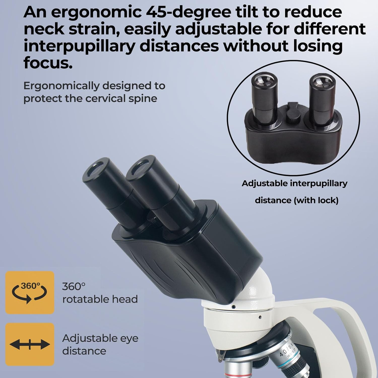 - [Ergonomic Design]: Biological Microscope with an ergonomic 45-degree tilt to reduce neck strain, easily adjustable for different interpupillary distances without losing focus.