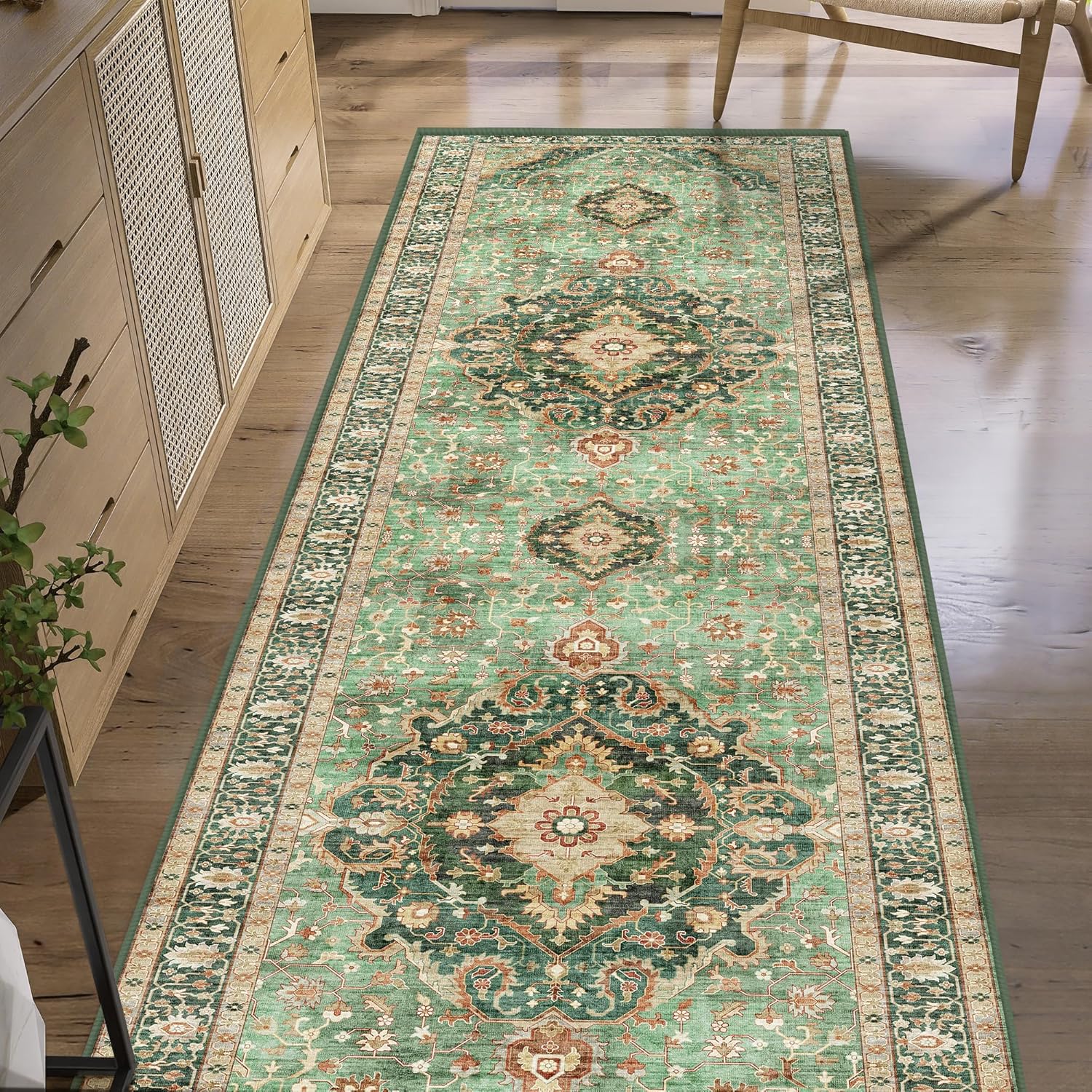 Green Runner Rugs 2x10 Boho Small Washable Area Rugs for Entryway Bathroom Kitchen, Long Rugs for Hallway Soft Low Pile Non-Slip Rubber Backing Oriental