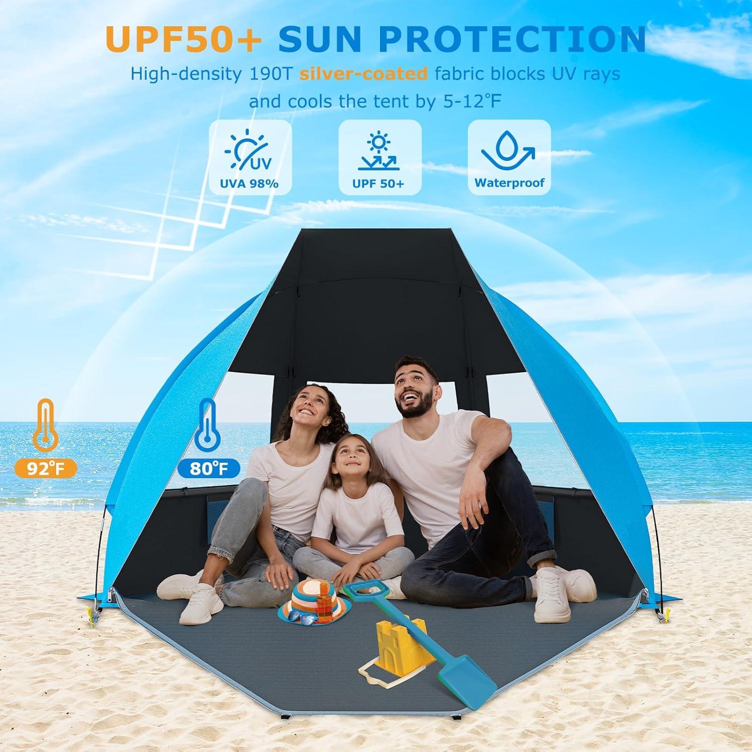 - Ultimate Sun Protection for Peace of Mind: There’s nothing better than enjoying the beach without worrying about harmful UV rays. Our beach sun shelter is made with 210T dark shelter polyester fabric that offers UPF 99+ protection, blocking up to 99% of UV rays. Stay cool, stay safe, and enjoy every moment under the sun with peace of mind
