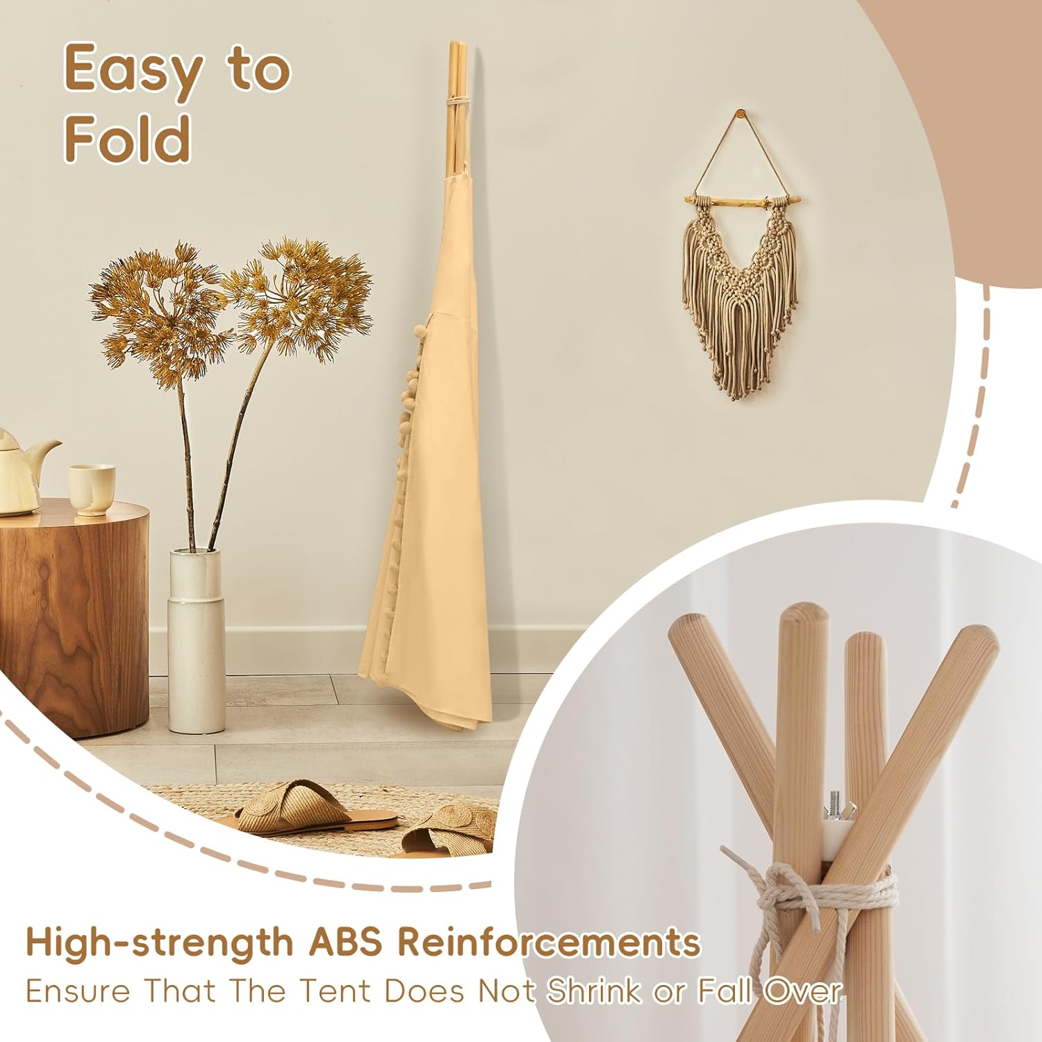 Teepee Tent for Kids with Mat, Cotton Canvas Kids Teepee with Pompom for Toddlers Indoor Play Tent for Girls Boys with Stars Lights, Carry Bag, Banner Flag (Khaki)
