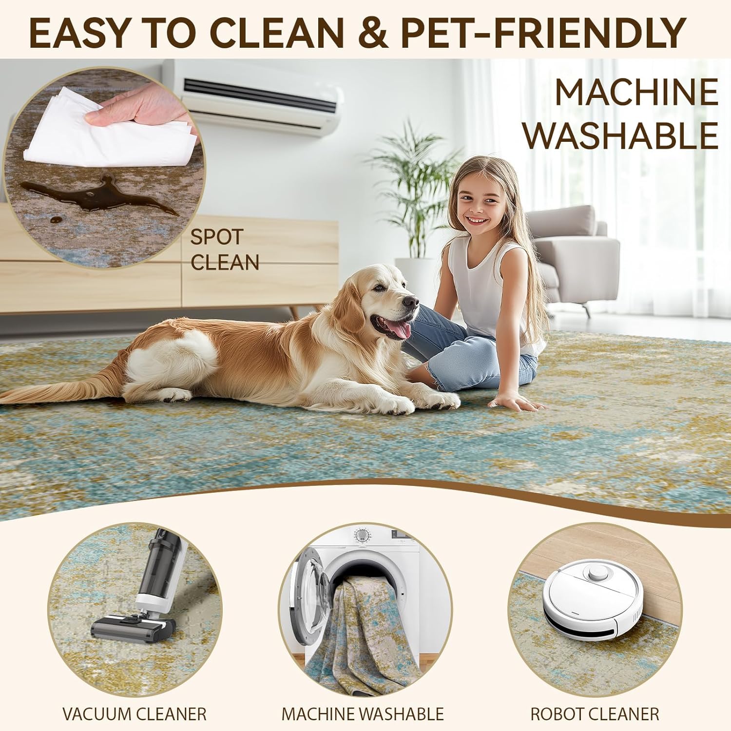 Washable Area Rugs 6'x9' Non-Slip Modern Abstract Soft for Living Room Entryway Bedroom Nursery, Print Pattern, Teal Blue Taupe