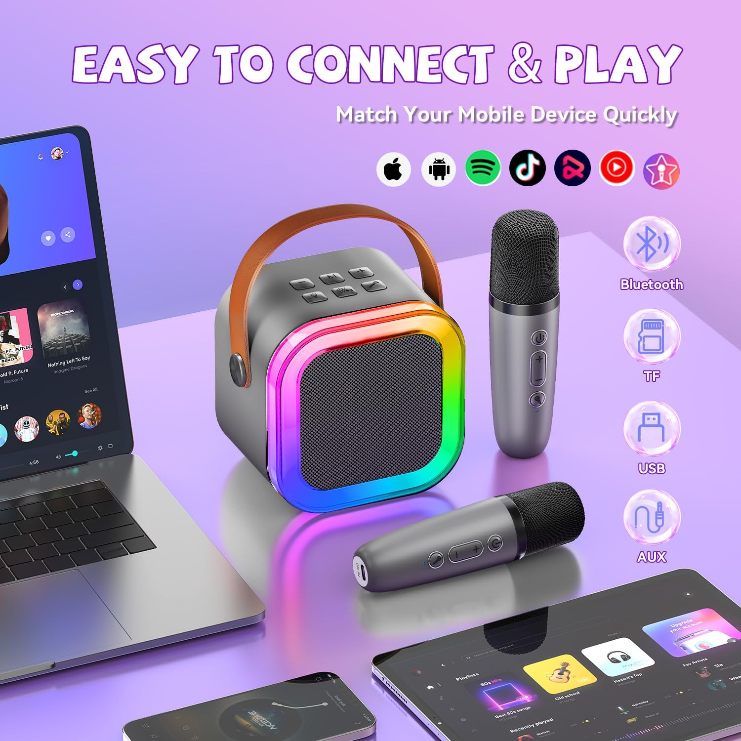 【2025 Newest】 Mini Karaoke Machine for Kids Girls & Boys - Portable Bluetooth Speaker with 2 Wireless Microphones - Kids Birthday Gifts for Ages 4-10 - Kids' Instrument Accessories - Space Gray