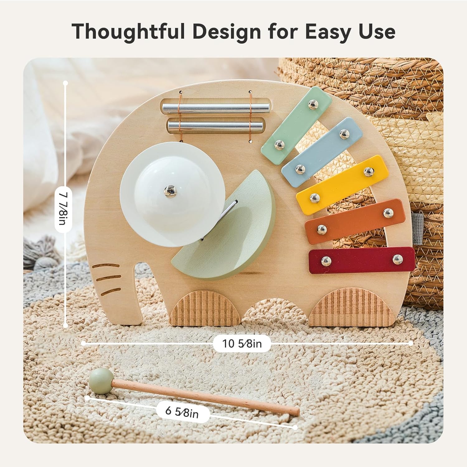 - 5-in-1 Musical Adventure: This elephant toy combines five instruments: Xylophone melodies, cymbal clangs, guiro scrapes, castanet clicks, and chime rings spark multi-sensory sound exploration.
