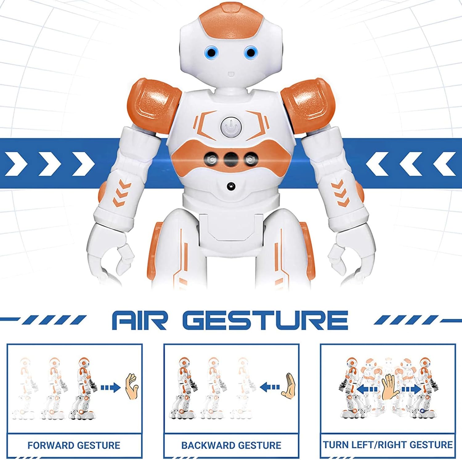 - Remote Control and Hand Gesture Control : This gesture sensing robot not only can be controlled by infrared controller, but also can turn left ,turn right, slide backward, and slide forward according to how your hand gesture commands; Multi function includes auto display and obstacles avoidance as well;The toy robot’s eyes light up with bright blue illuminating LED when it moves