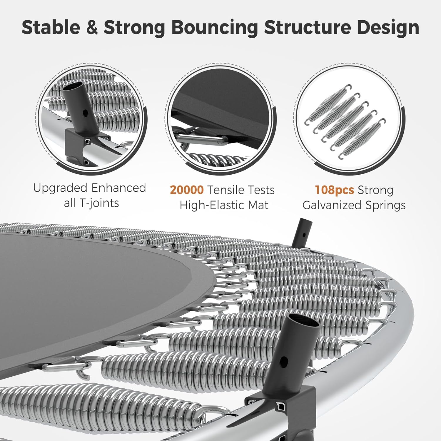 - 【Premium Bouncing Experience】This Tatub large trampoline is supported by 108 robust springs, guaranteeing stability with every bounce. Its heavy-gauge galvanized steel frame forms 6 W-shaped legs with bars, providing a solid foundation for the jumping zone