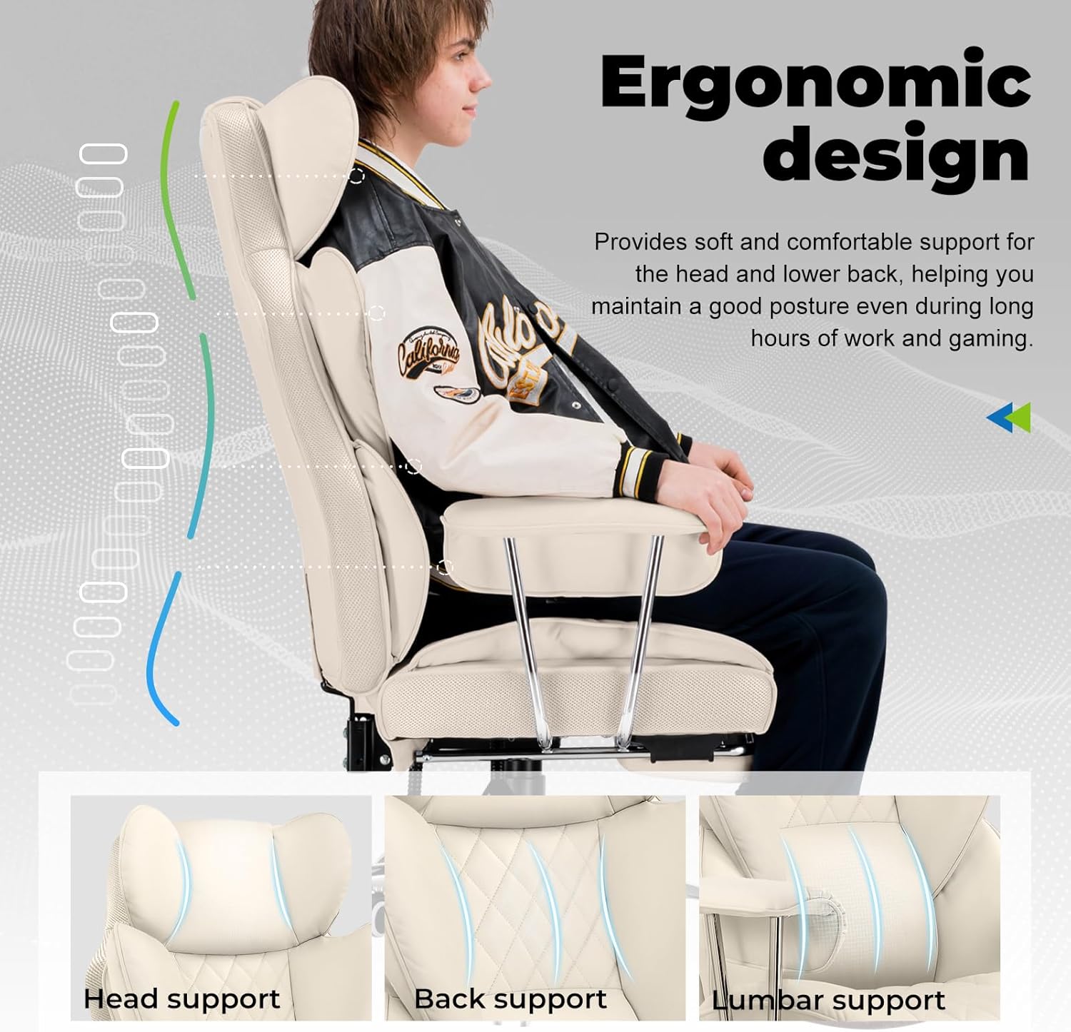 - 【Ergonomic Full-Body Design】Specifically designed for pressure dispersion and body support, the backrest features 3D wrapping lumbar support with dual-layered high-density foam and high-loft fiber, conforming to the curves of your neck, shoulders, and back. The oversized adjustable lumbar pillow provides personalized support, delivering a sofa-like embracing comfort.