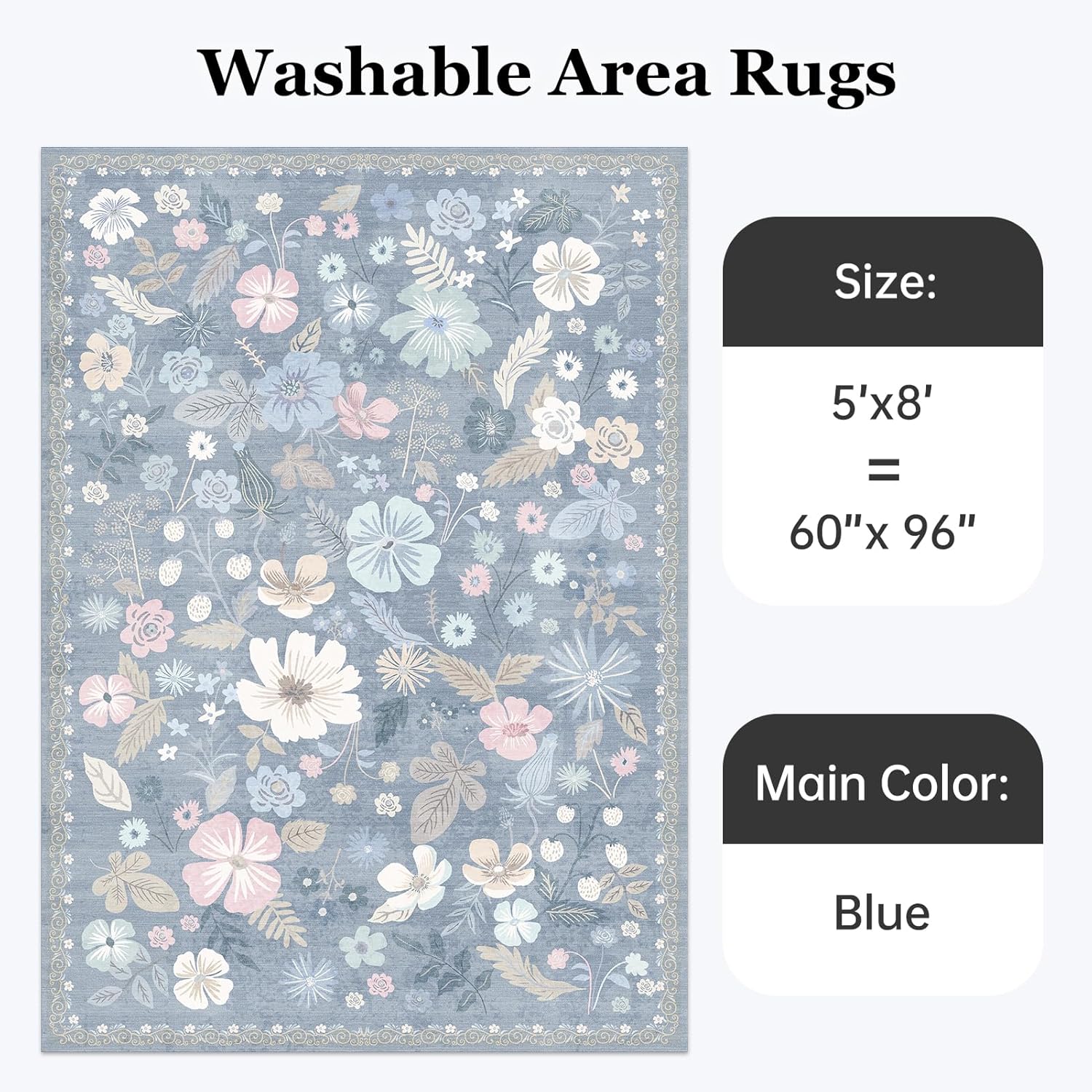 Blue 5x8 Area Rugs for Living Room Washable Soft Faux Fur Elegant Vintage Rugs Boho Floral Non Slip Stain Resistant Sound Absorbing Low Pile Carpet Rug for Bedroom Dining Room Nursery
