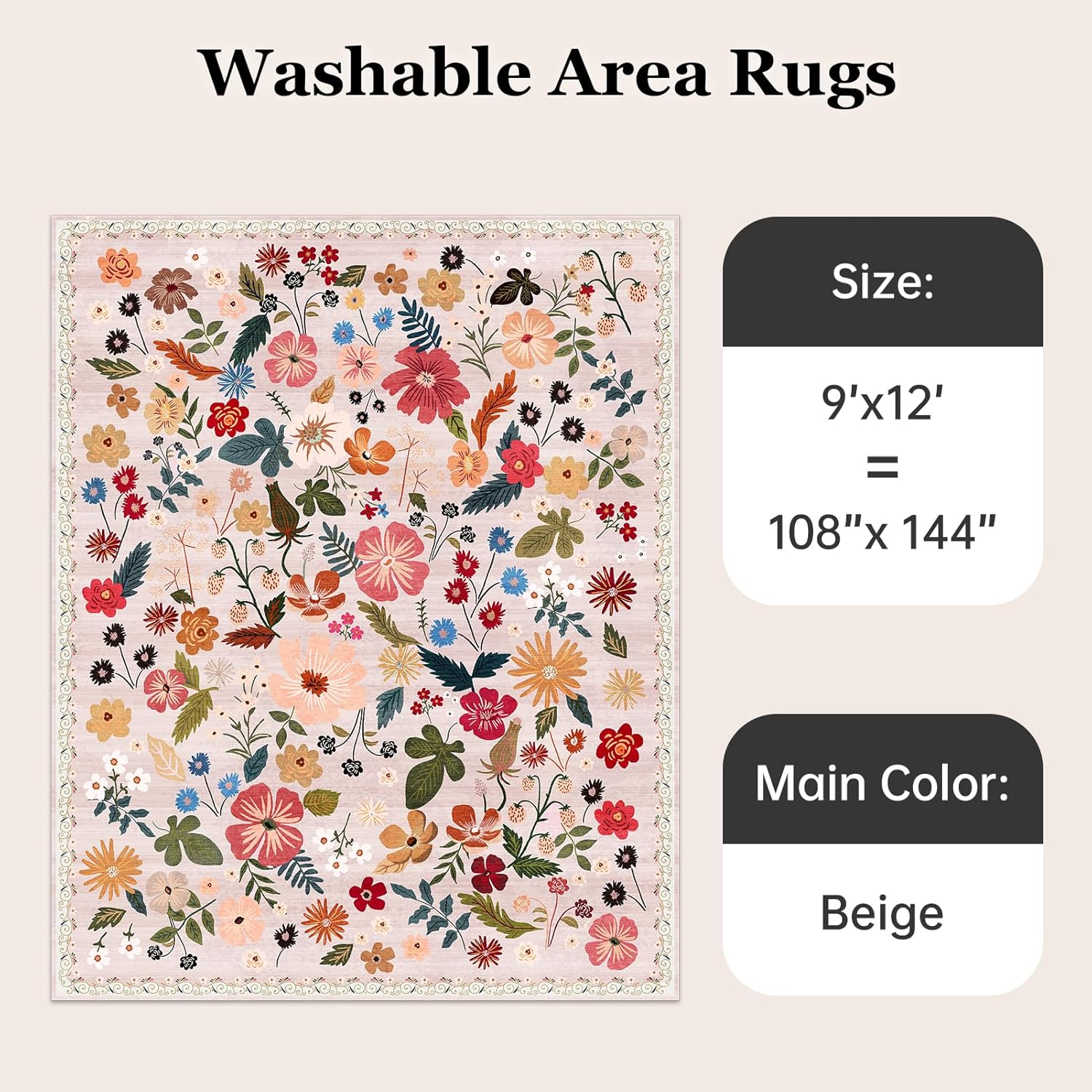 9x12 Washable Area Rugs Beige Pink Boho Floral Soft Girls Rugs for Bedroom Sound Absorbing Ultra-Thin Non Slip Stain Resistant Room Carpet Rug for Living Room Kids Playroom Farmhouse Dining Room