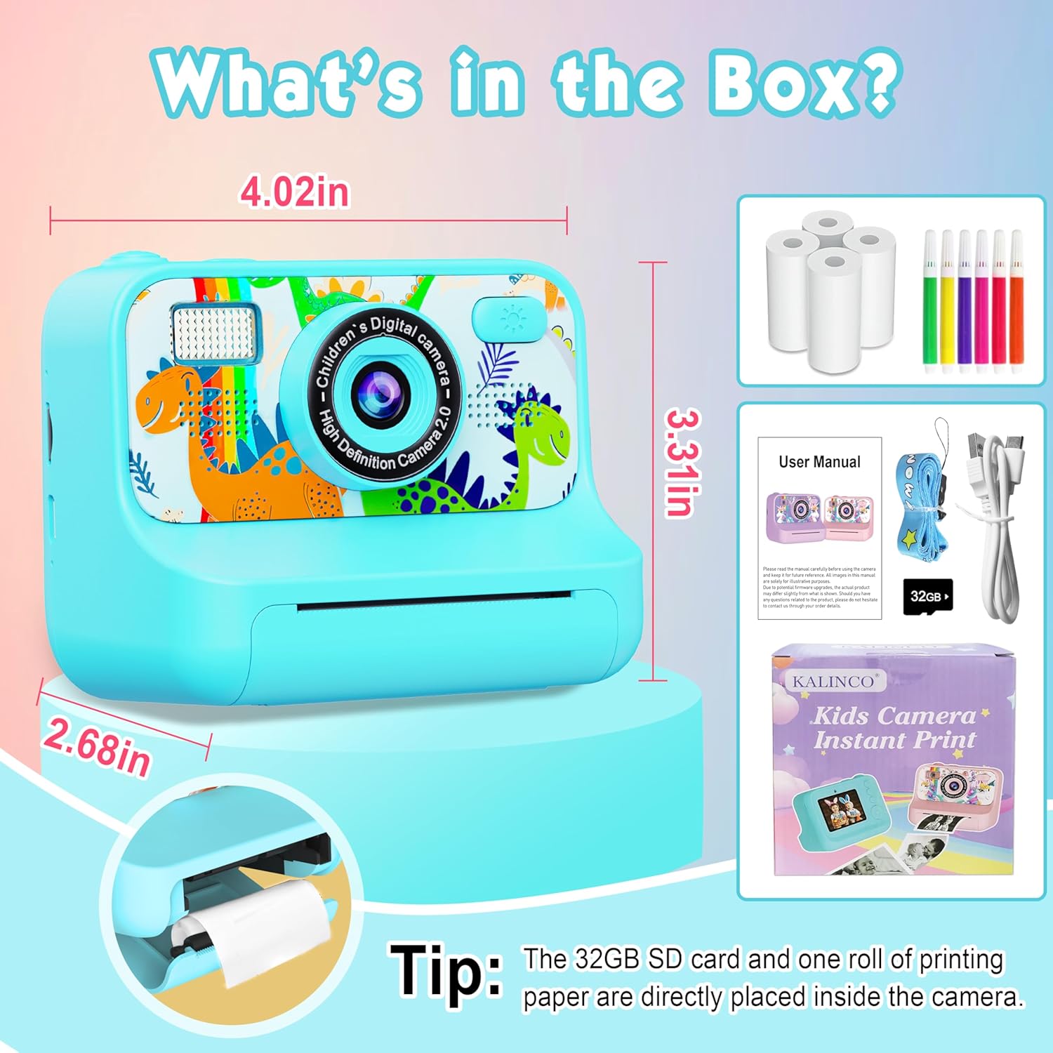 - Why Our Kids Camera is the Perfect Choice: It comes with: 1x Kids Instant Print Camera, 4x Printer Paper(1 roll is already installed), 1x Exquisite Packing Box, 1x Type C Charging Cable, ,1x 32GB SD Card (Pre-installed in the camera ), 1x Hanging Lanyard, 6x Color Pen, 1x User Manual. We stand behind our products. If you have any questions or need assistance, contact us anytime. We’re here to provide quick and perfect solutions. anywhere. Equipped with advanced thermal printing technology, it requires no ink or toner and is BPA-free, providing a safe and eco-friendly printing experience for kids. Perfect for parents who want to ensure their children’s safety while they have fun.