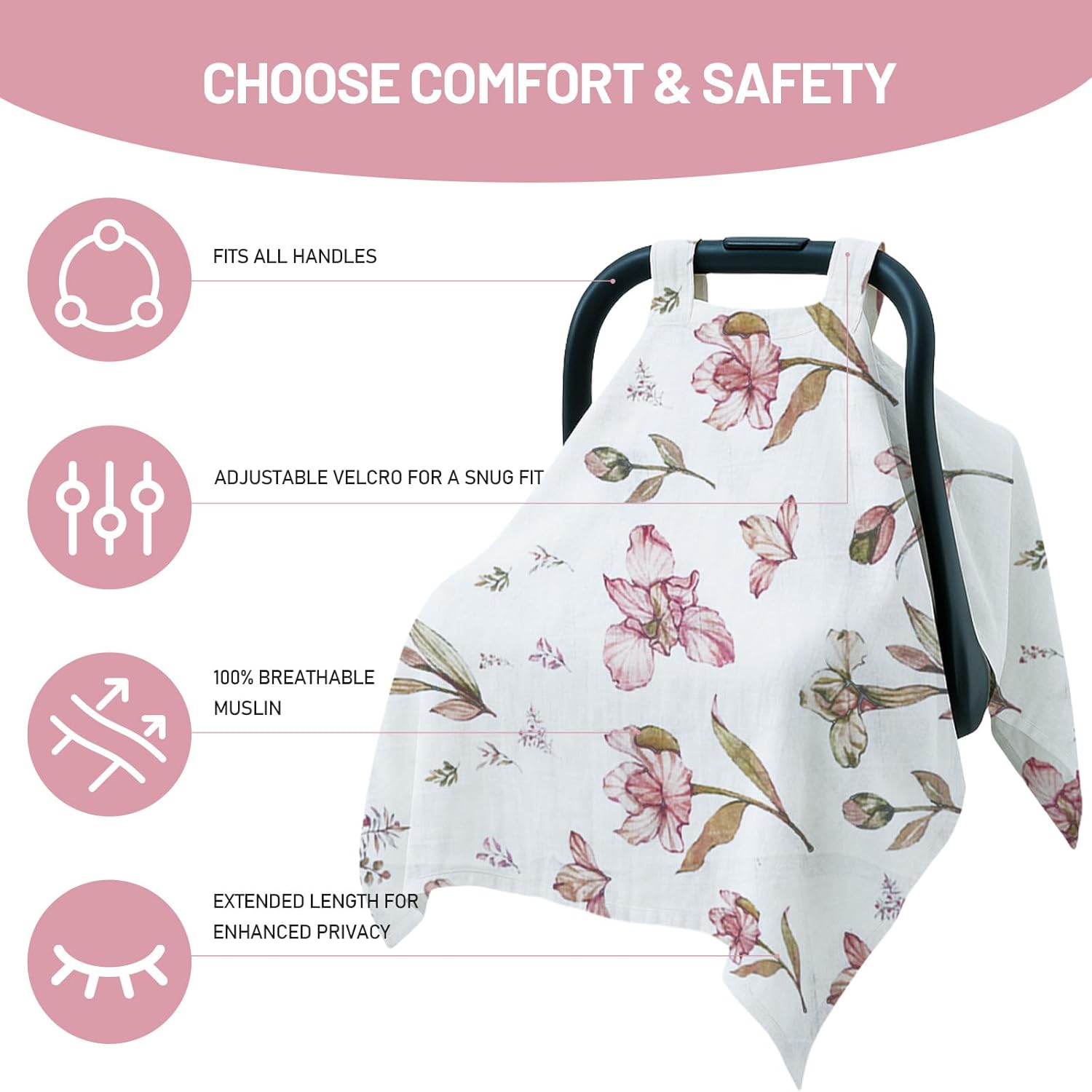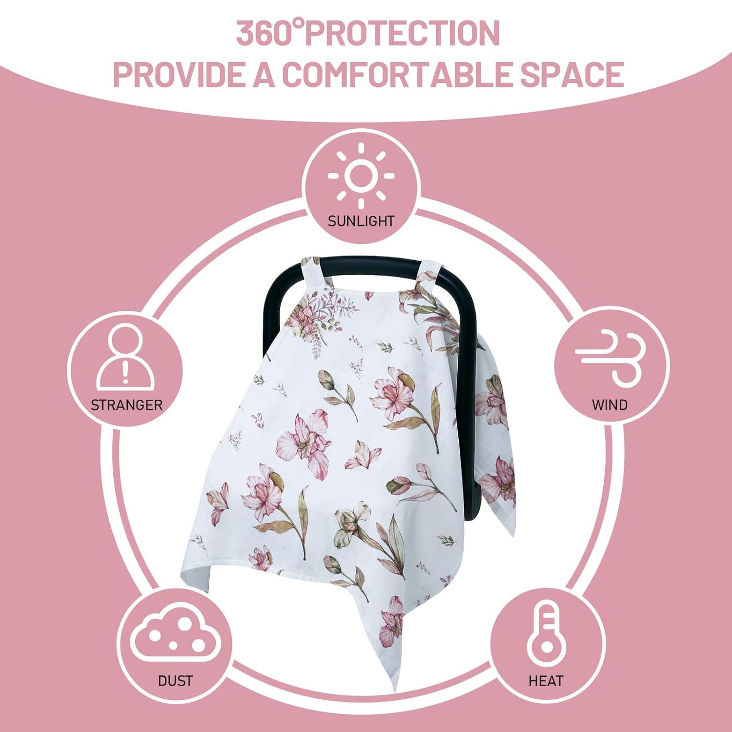 - Premium Thin-Layer Muslin Fabric: Made from high-quality muslin, this baby carseat cover offers a cool, breathable environment perfect for warm weather—providing a delicate, soft feel that’s both comfortable and durable.