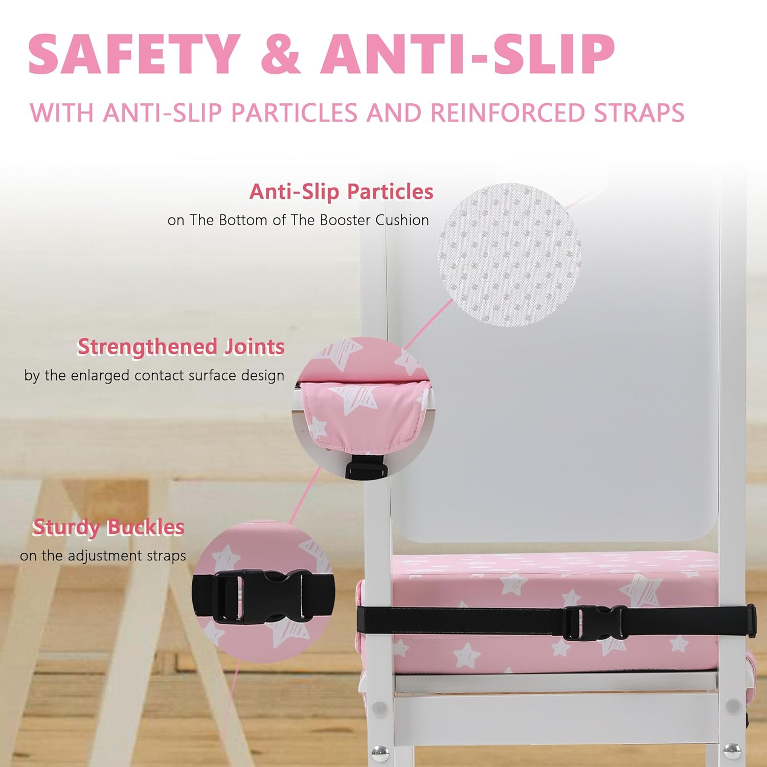 - 【Safety & Anti-slip】The booster seat for table features anti-slip particles and reinforced straps. The anti-slip particles provide excellent resistance to prevent the seat from sliding on the surface of the chair. This ensures your baby stays firmly in place while sitting. The straps add an extra layer of safety, keeping the seat securely fixed to the chair and minimizing the risk of movement. Your baby will be very safe and stable during mealtime or any other activity at the kitchen table.