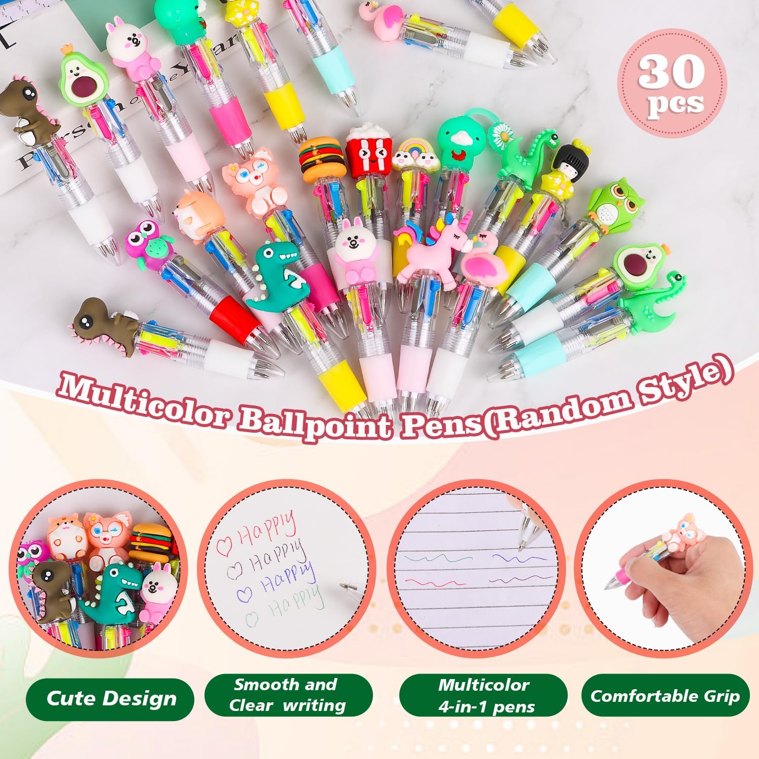 LOKIPA 30 PCS Multicolor Pen in One - 4-in-1 Cute Pens for Kids Mini Ballpoint Pens for Kids Birthday Gifts Classroom Prizes(Random Style)