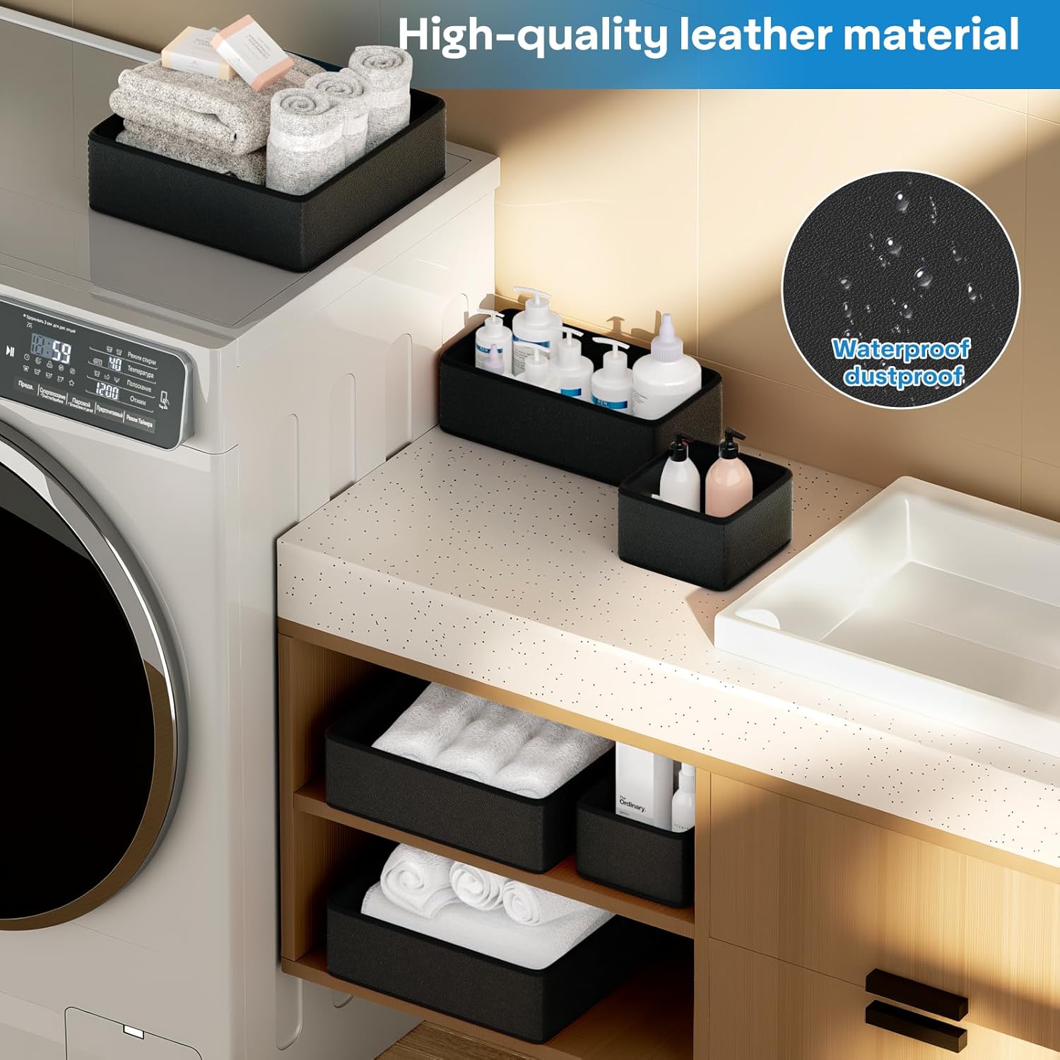 - ăLuxurious Decorateă Decorate your space with our vegan leather drawer organizers. This 12 piece set features three versatile sizes (3 Large: 11"x11"x4.5", 3 Medium: 11"x5.5"x4.5", 6 Small: 5.5"x5.5"x4.5") ,You can place them anywhere in your home or office.Don't worry about the dust on the outside,Just wipe them with a wet tissue and they'll be as clean as new.