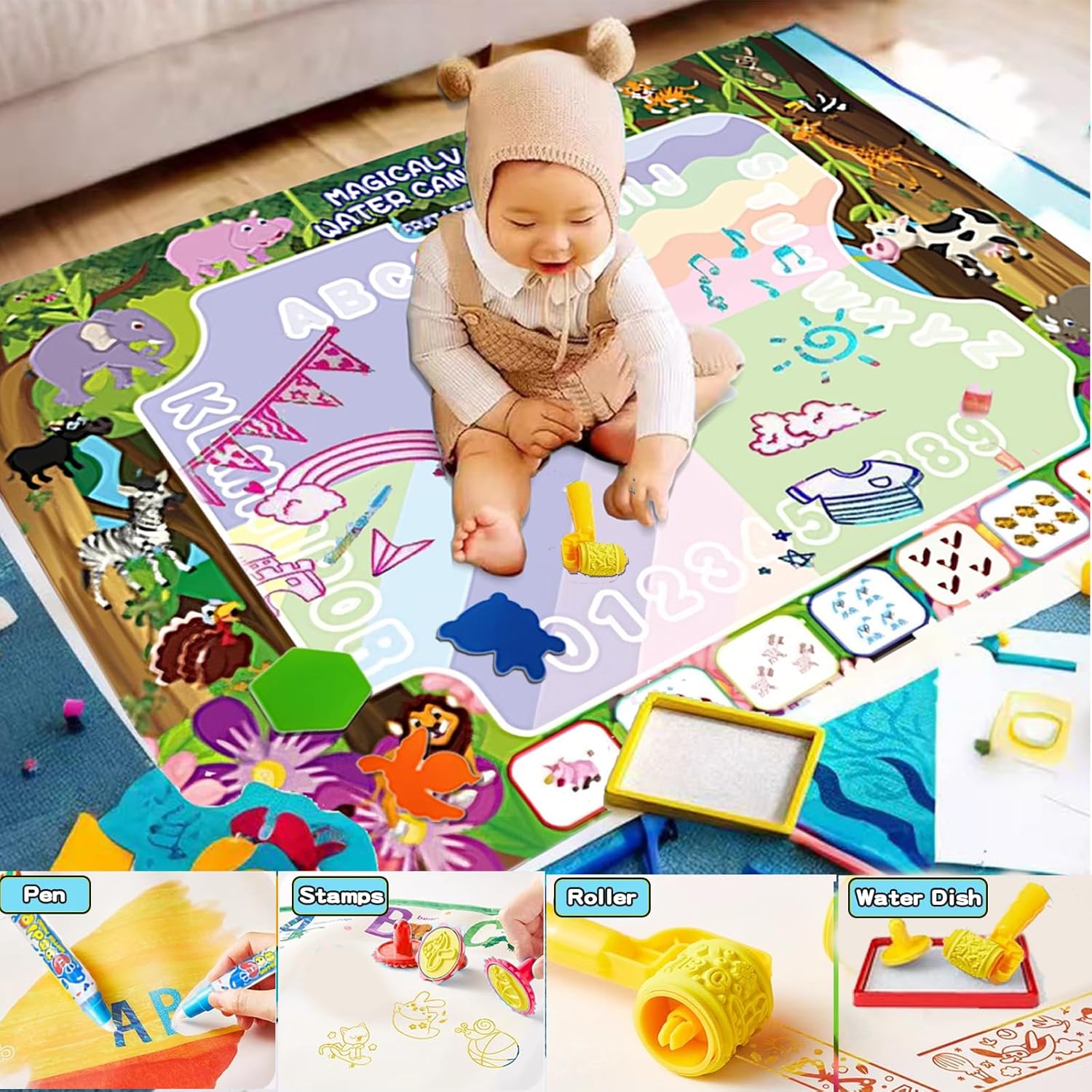 Water Doodle Mat - Magic Water Drawing Mat with Stamps, Roller & Backpack Big Enough Space for 2-3 Kids to Draw Together | No Mess Travel Toy Gift for 3 4 5 6 7 8 Year Old Girls Boys