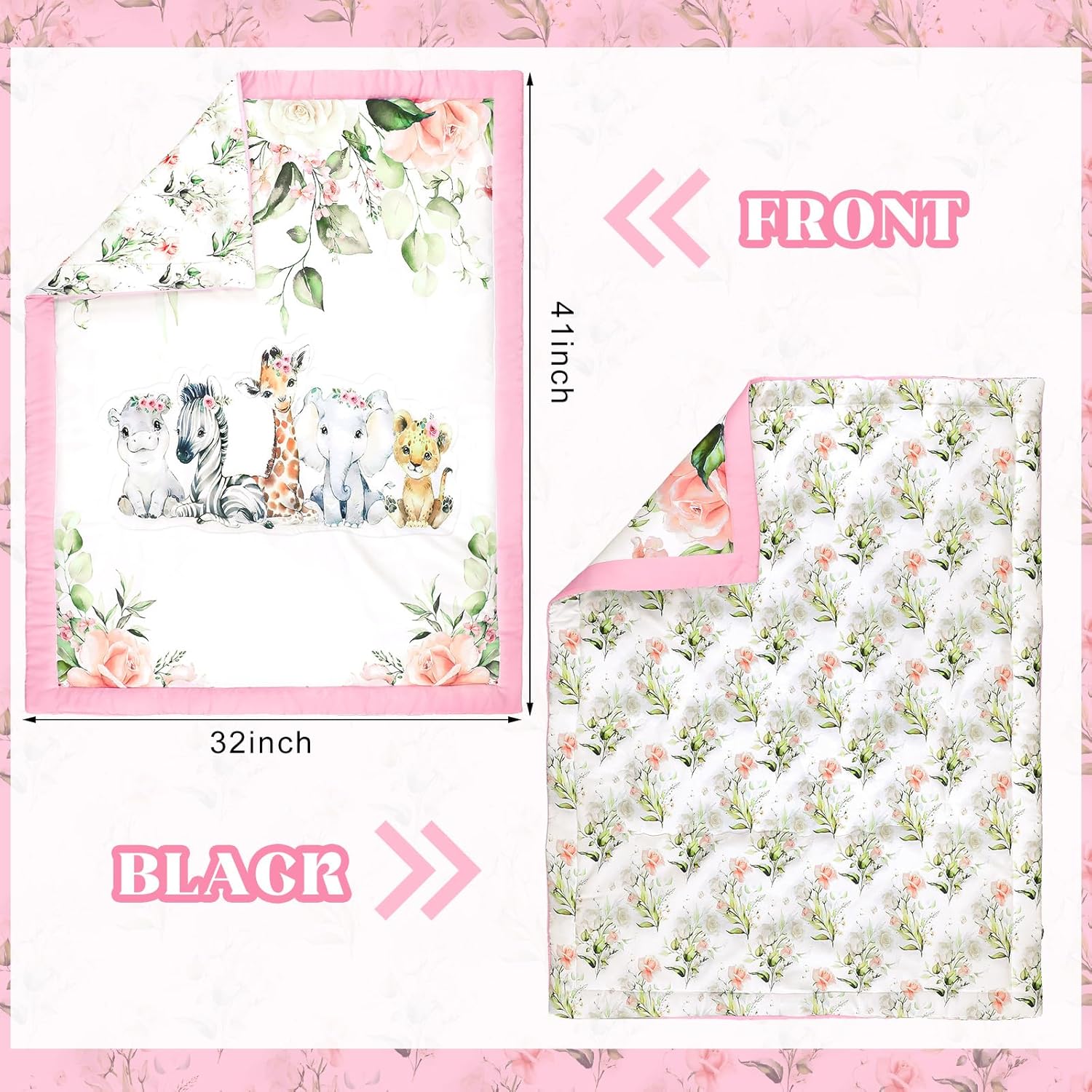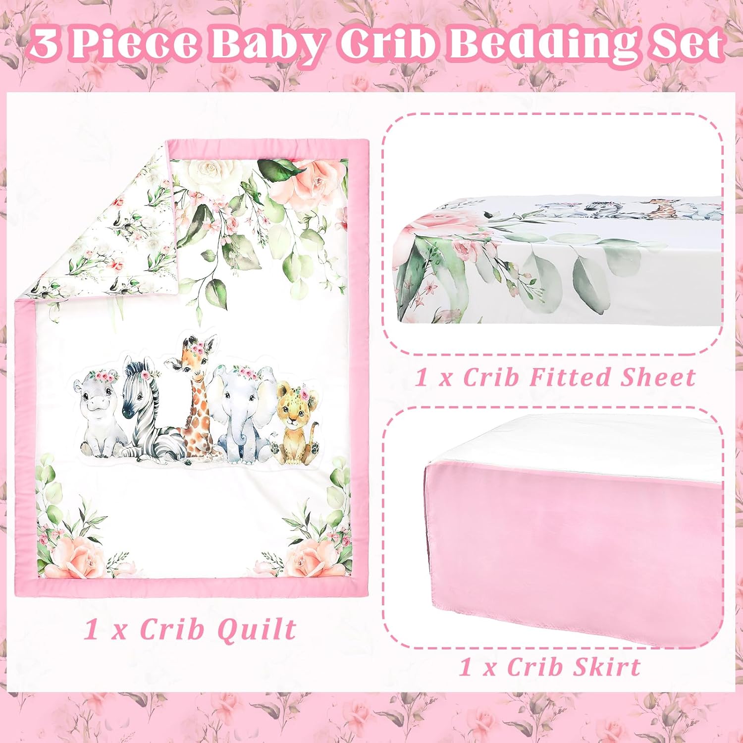 3 Pcs Baby Crib Bedding Set Safari Animals Dinosaurs Bear Woodland Animals Jungle Crib Set Includes Quilt, Fitted Sheet, Skirt for Baby Boy Girl(Pink,Safari)