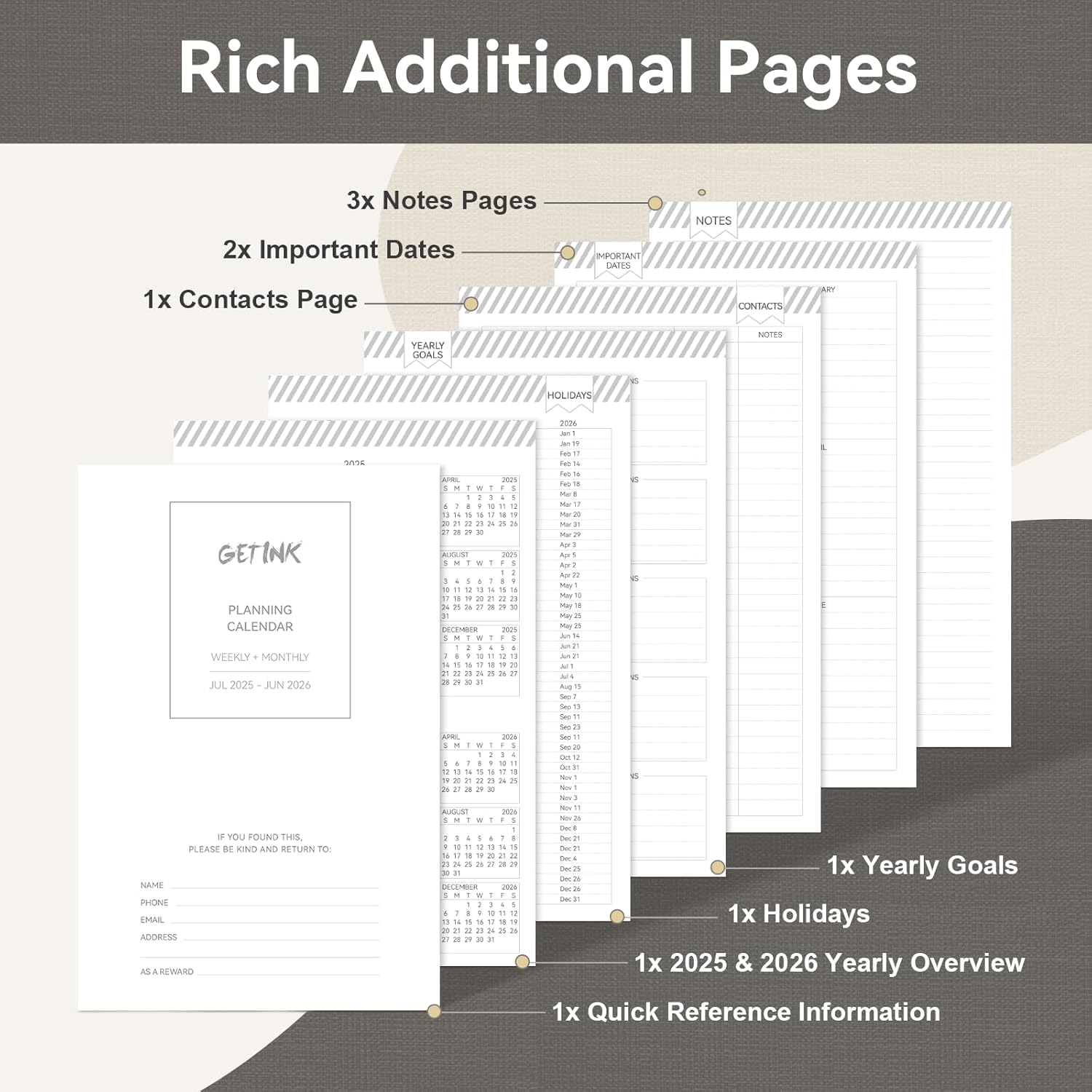 - Comprehensive Year-Round Planning: Stay organized from July 2025 to June 2026 with clear monthly and weekly pages. Includes sections for personal information, yearly overview, goal setting, important dates, holidays, contacts, and notes for efficient time management.