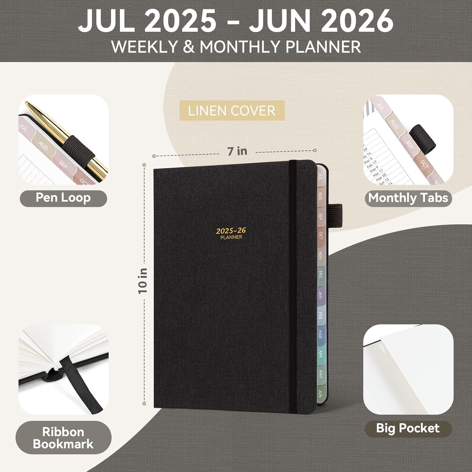 Getink Linen Cover 2025-2026 Planner Weekly & Monthly Daily Agenda Book,2025-2026 To Do List Notebook with Colorful Monthly Tabs, Inner Pocket, Elastic Closure (Black, 7.3 * 10)