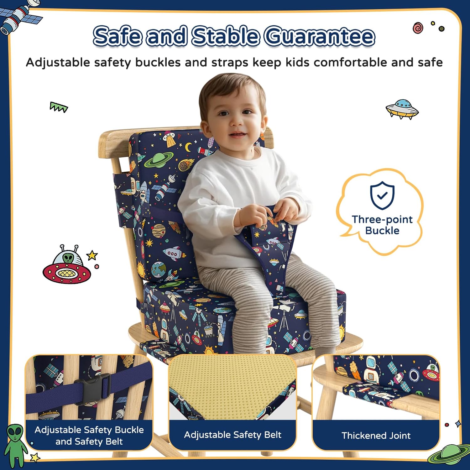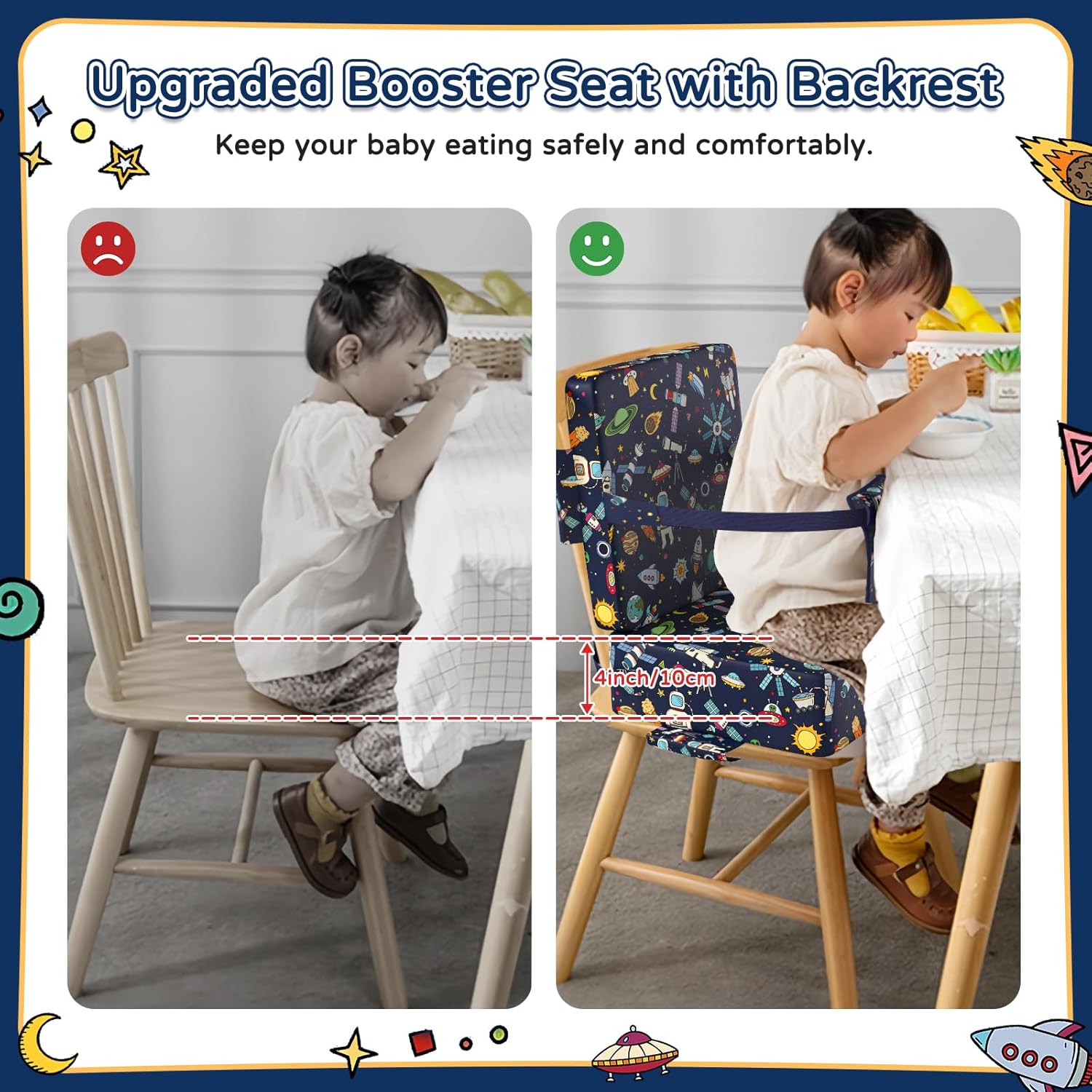 - 【Cute appearance】: We have carefully designed various colors and a variety of interesting cartoon patterns for the booster seat, such as astronauts, spaceships, aliens, satellites, airplanes and other science fiction patterns, bright colors, full of childlike fun, deeply loved by children, and stimulate their interest. This baby booster seat for table can give your baby an equal opportunity to dine with adults, allowing children to enjoy a wonderful family dining time.