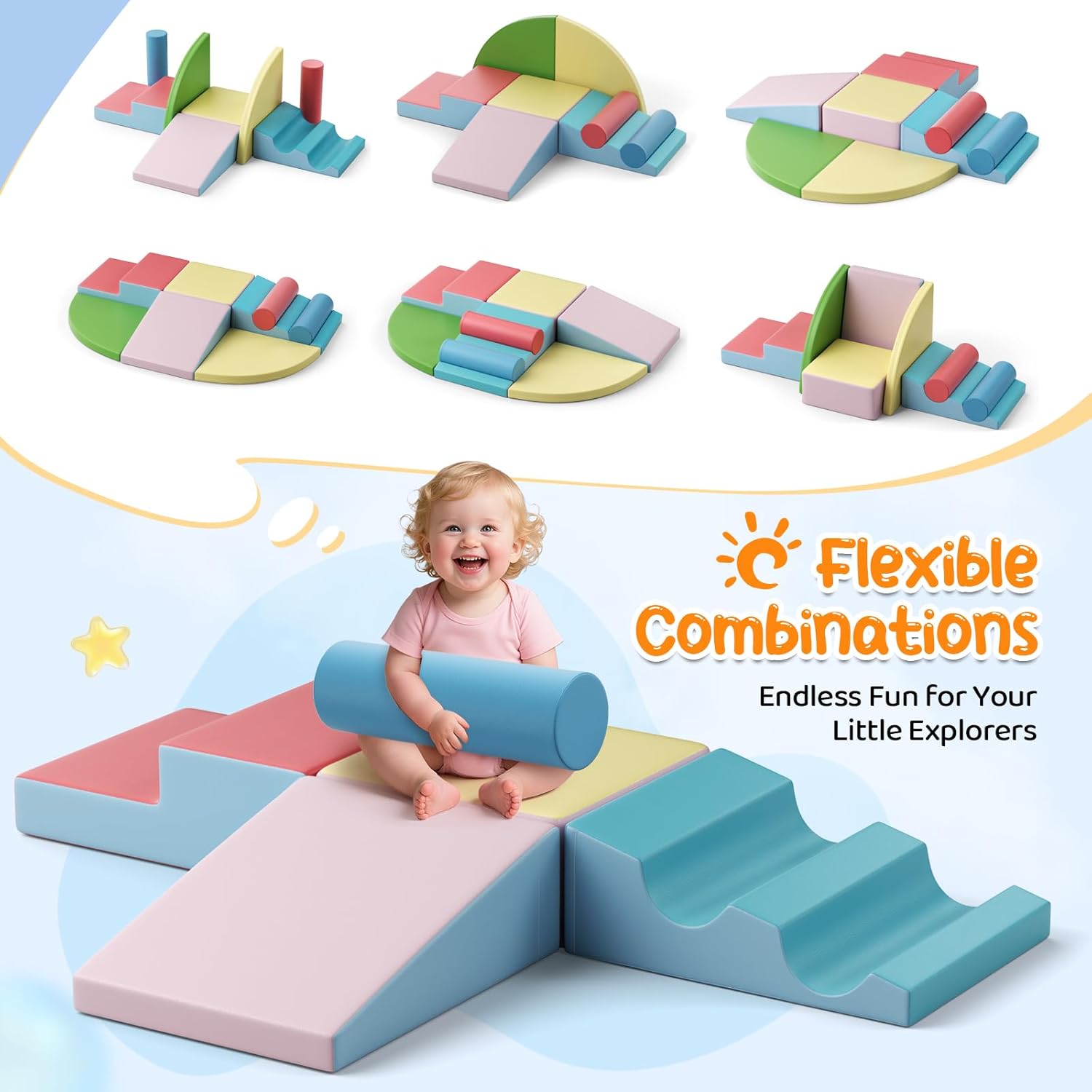 - π "Soft Play Set New upgrade" Lischwert climb and crawl activity play set incorporates with 8 foam climbing blocks, which are 1 steps, 1 square blocks, 1 climbing blocks, 1 slide, 2 pads and 2 Cylindrical building blocks. They can be rearranged and set up in different ways, creating a colorful and engaging play experience.
