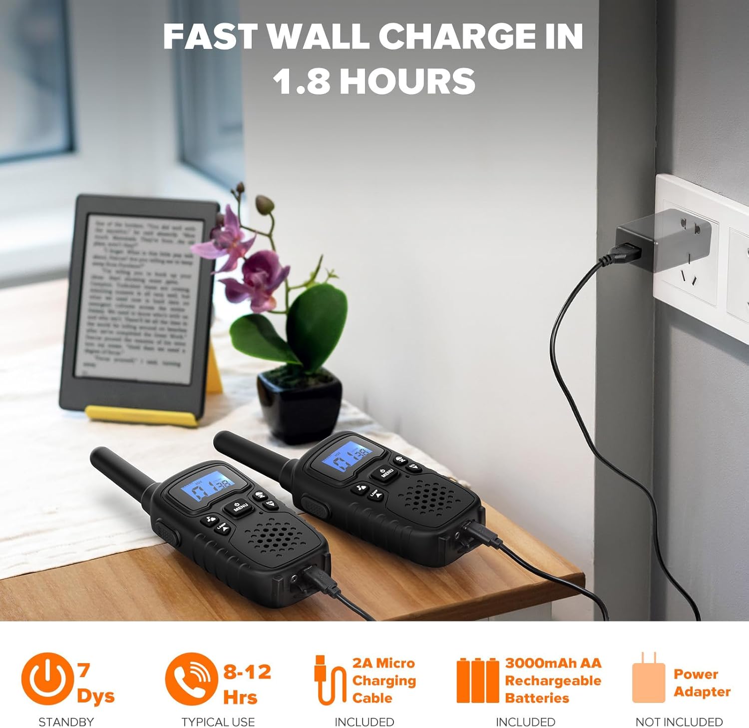 - UNLIMITED COMMUNICATION TIME β The rechargeable walkie talkie supports micro USB charging. You can charge them indoors, on the road, and even camping and hiking, and you do not need to pay for batteries, again and again, saving stress and money for you.