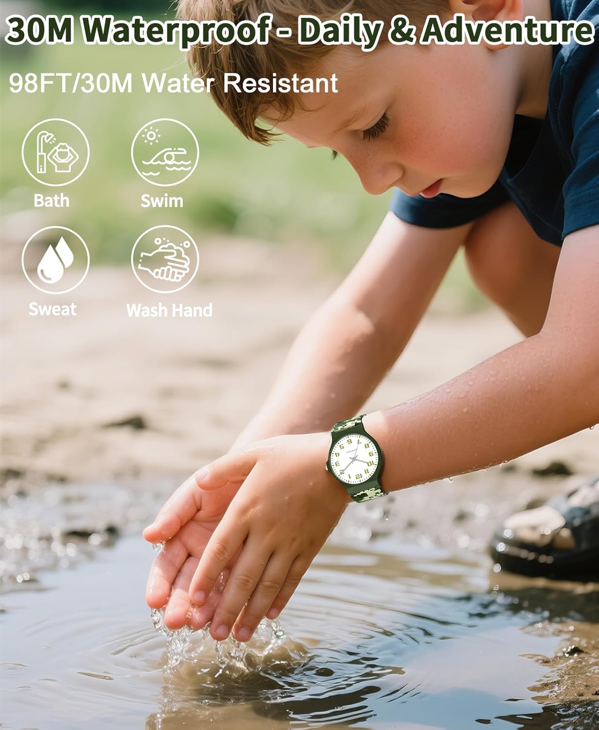 - 【3ATM Waterproof Analog Kids Watch】 Life waterproof, can wash hands, splash, rain, etc., but can not be used in high temperature, and can not pull out the knob in the water.