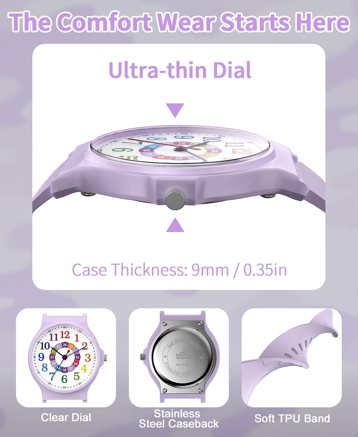 • 【Time Teaching Kids Watch】This analog watch adopts a high-definition acrylic mirror, which can clearly see the numbers and green hands of the dial, improving the efficiency of learning time.
