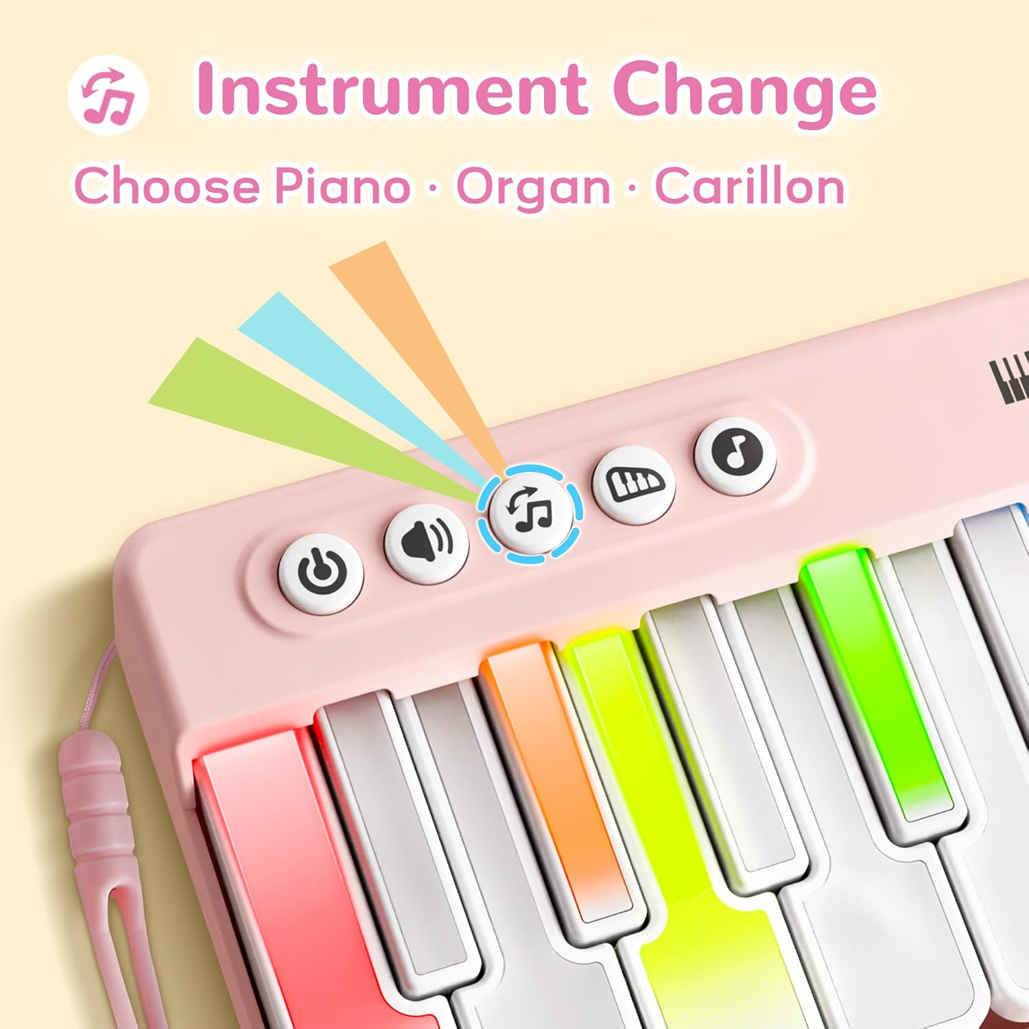 - ♫Interactive Musical Exploration♫ 15 keys with rainbow light + 5 function buttons! Kids adjust volume, switch 3 instrument sounds (piano/violin/organ), and follow lights to learn play.