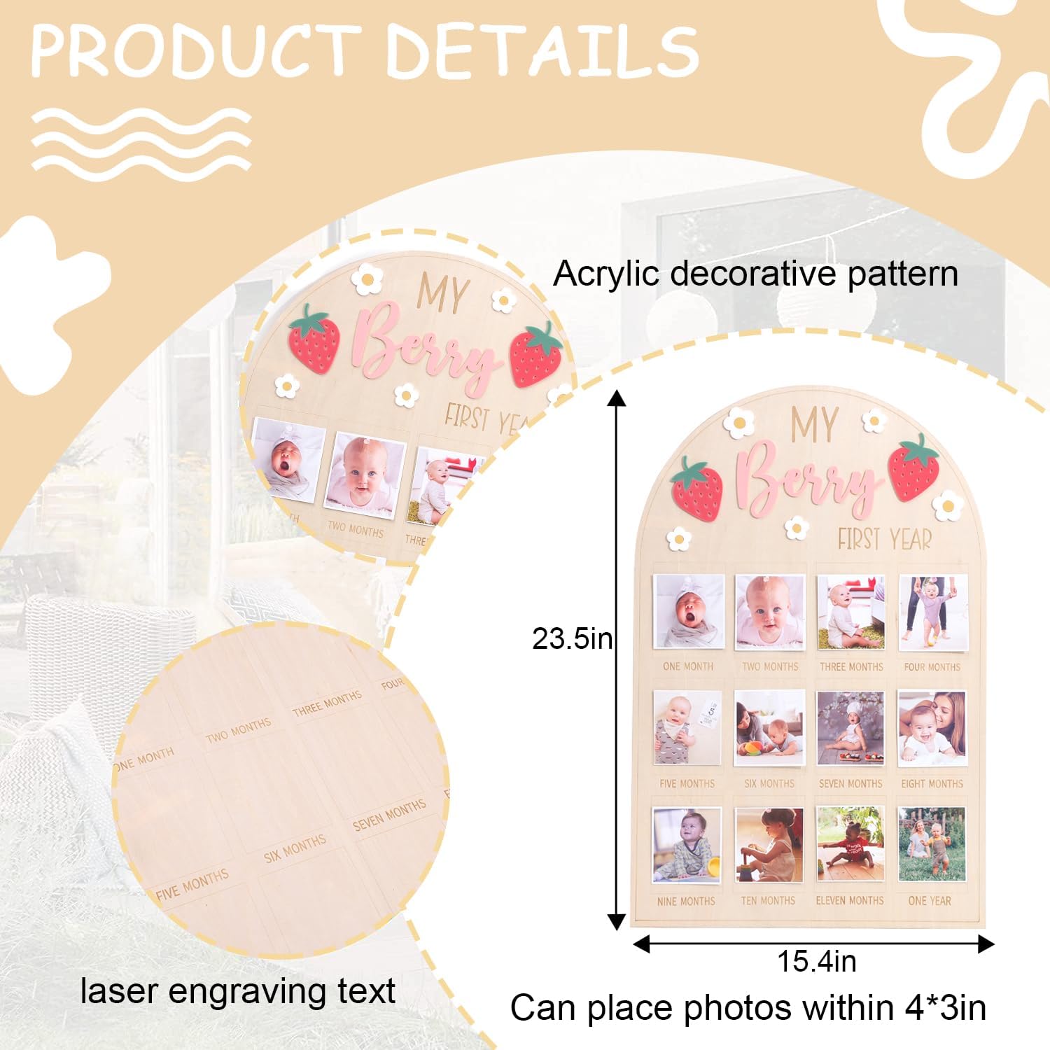 - STRAWBERRY MONTHLY PHOTO BOARD: Choose our stylish and charming berry 1 to 12 months photo wood board and start the wonderful journey of documenting growth! It will make the process sweet and cozy and bring more memories to your family