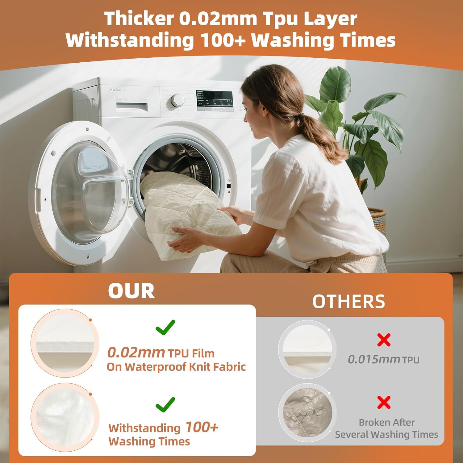 - THICKER 0.02MM TPU LAYER WITHSTANDING 100+ WASHING TIMES: Unlike cheaper full mattress protector which will break after 20 washes (leaving you with embarrassing leaks). The TPU we used of Lofe full mattress protector waterproof is 0.02mm which is much thicker than 0.015mm in the market. This means the waterproof mattress protector can withstand more washing times and still stay waterproof after washing. You just spend a little more money but get a more durable organic mattress protector equivalent to 10 ordinary mattress protectors.