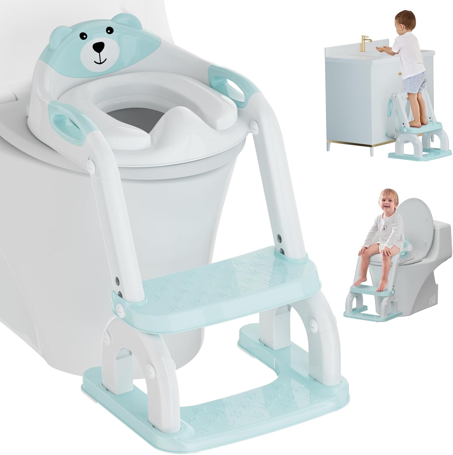 - ✅[WORRY-FREE SAFETY MATERIAL]: Confidently supports up to 120 lbs. Made with food grade BPA-Free PP materials, non-toxic, odorless, make every contact feel at ease. The smooth edges of potty training seat with step stool adds extra peace of mind for your little climber, also incredibly easy to wipe clean after any mess.