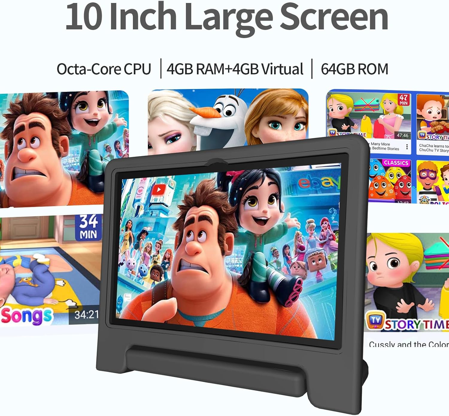 JREN Tablet for Kids|10 Inch Kids Tablet Android 14|Octa-core|64GB|WiFi |Bluetooth|Parental Control|Children Content|Children Toddler Black