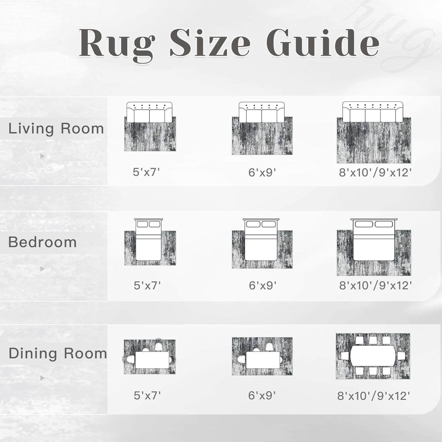- 【Rug Size Guide】5'x7'- Fits a loveseat, twin bed, or a dining table for 2-4 seats. 6'x9'- Fits a three-seater sofa, double bed, or a 4-seat table. 8'x10'- Fits a full-size sofa, queen bed, or a table for 4-6 seats. 9'x12'- Fits a sectional sofa, king bed, or a table for 6-8 seats.