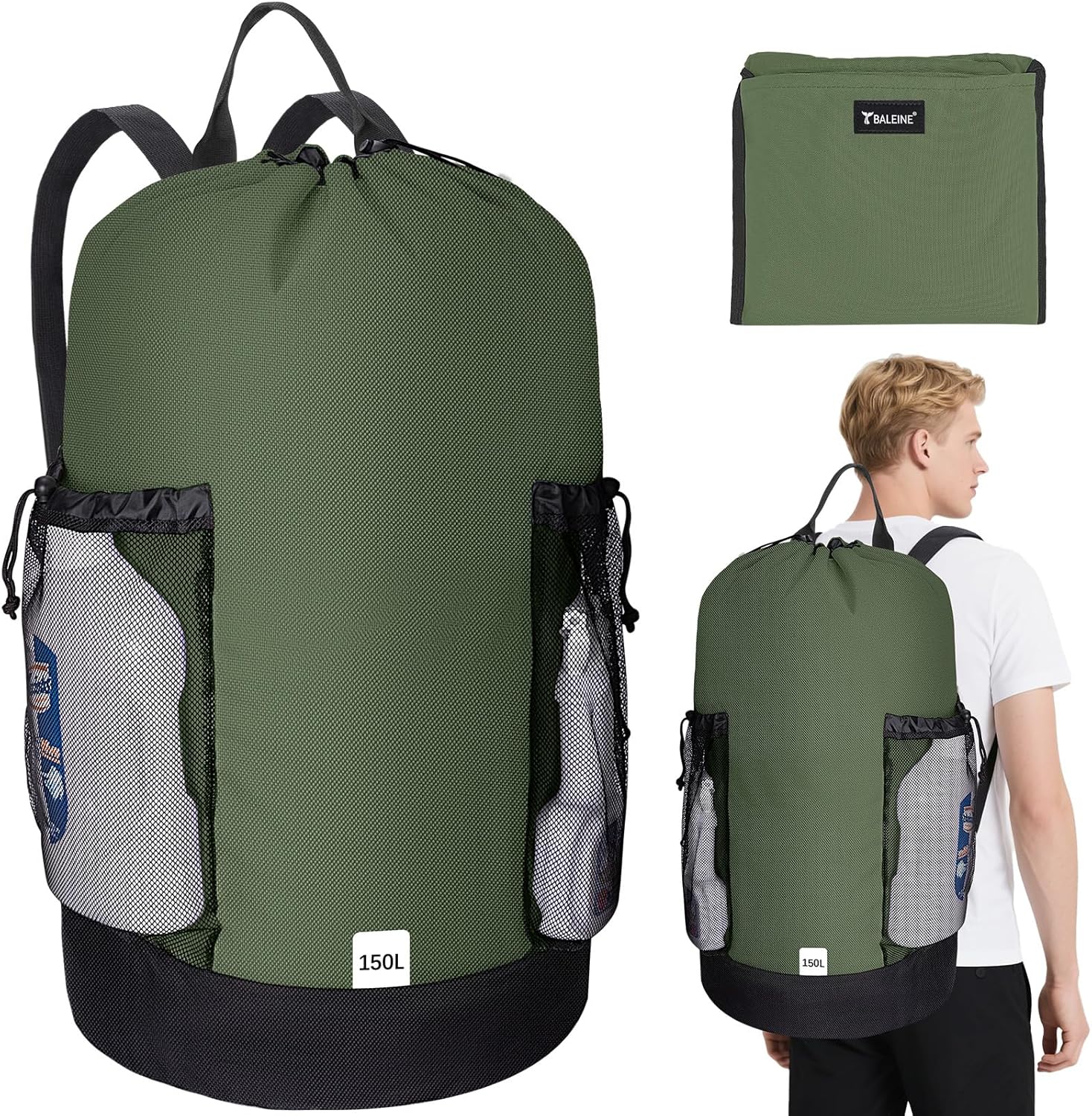 BALEINE 150L Laundry Bag Backpack, 900D Oxford Fabric Large Travel Laundry Bags with Shoulder Straps and 2 Mesh Pockets for College Dorm, Apartment, Laundromat (Green, 150L)