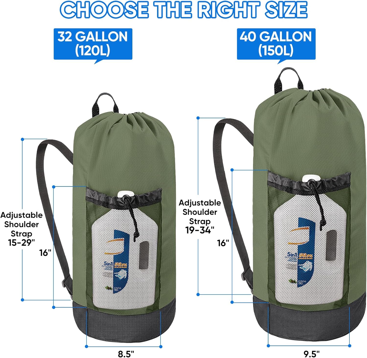- 150L Large Laundry Bag: These travel laundry bags measure 32 "H X 16 "L with a large capacity of up to 150 L, enough for holding 2-3 batches of clothes; They also feature two front mesh wash pockets (16 "H X 8.5"L each), making your laundry backpack have space for storing detergent, shoes, and other essentials