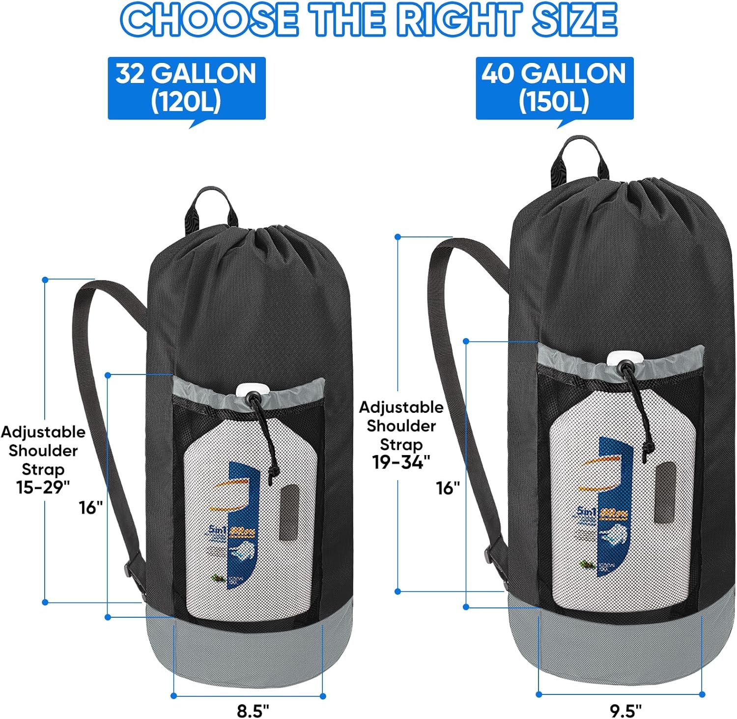 - 150L Large Laundry Bag: These travel laundry bags measure 32 "H X 16 "L with a large capacity of up to 150 L, enough for holding 2-3 batches of clothes; They also feature two front mesh wash pockets (16 "H X 8.5"L each), making your laundry backpack have space for storing detergent, shoes, and other essentials
