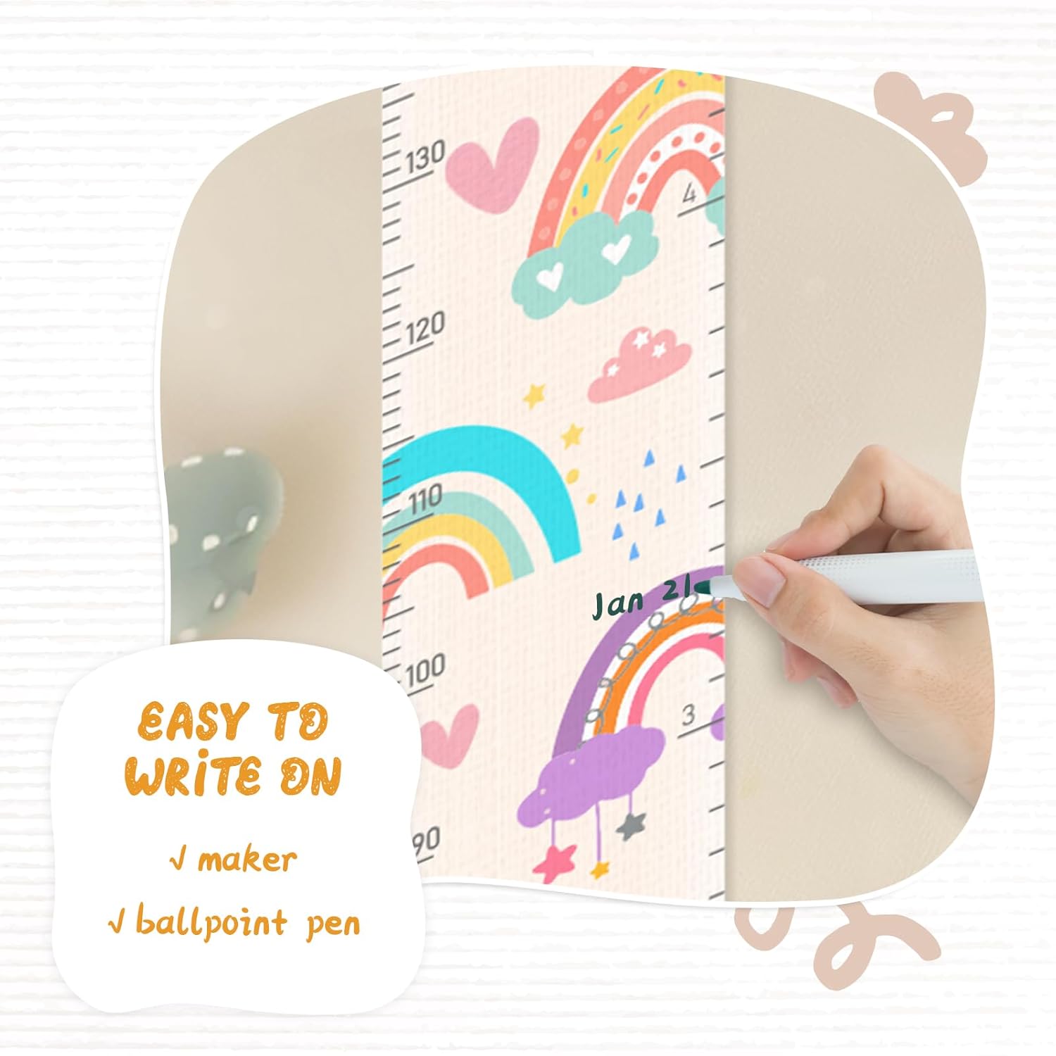 - Design: Kids growth chart with rope at the top of the chart, easy to install and removeable, foldable and portable design, easy to store, hang, roll up, transport, and save space. It boasts a material that's easy to write on, where you can use dark colored ballpoint pens and markers to track growth milestones. Our height ruler can clearly show your kids' height.