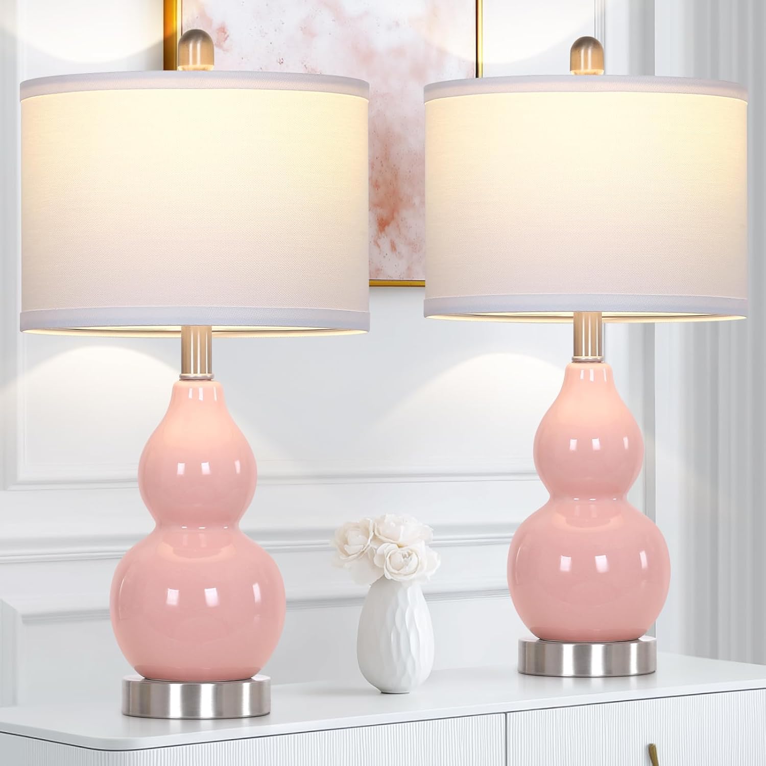- Modern Ceramic Table Lamps: Featuring a unique gourd-shaped ceramic base in a soft pink hue, this table lamp blends modern charm with functional design. Perfect for bedrooms, living rooms, or home offices, it serves as a stylish bedside lamp, reading light, or decorative lamp. This pink ceramic lamps casts a warm, soft glow ideal for relaxing or focused tasks.
