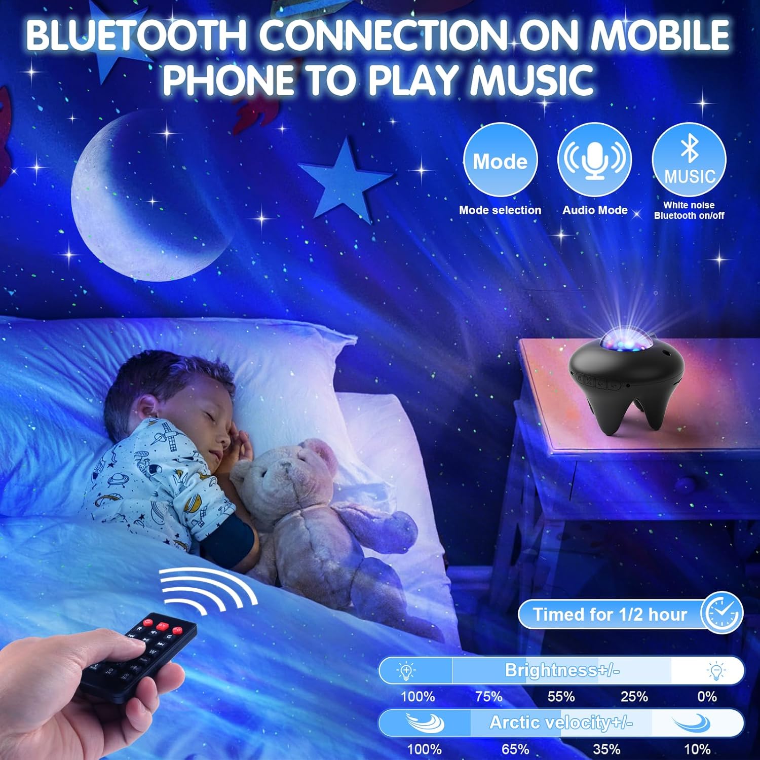 - 【Remote Control】The star projector can not only be operated through its own buttons, but also with the remote control by long distance, changing colors, adjust brightness, lighting mode, light effects, aurora light move speed, timer mode, turn on/off, white noise mode, bluetooth mode, voice control mode. It is very convenient.