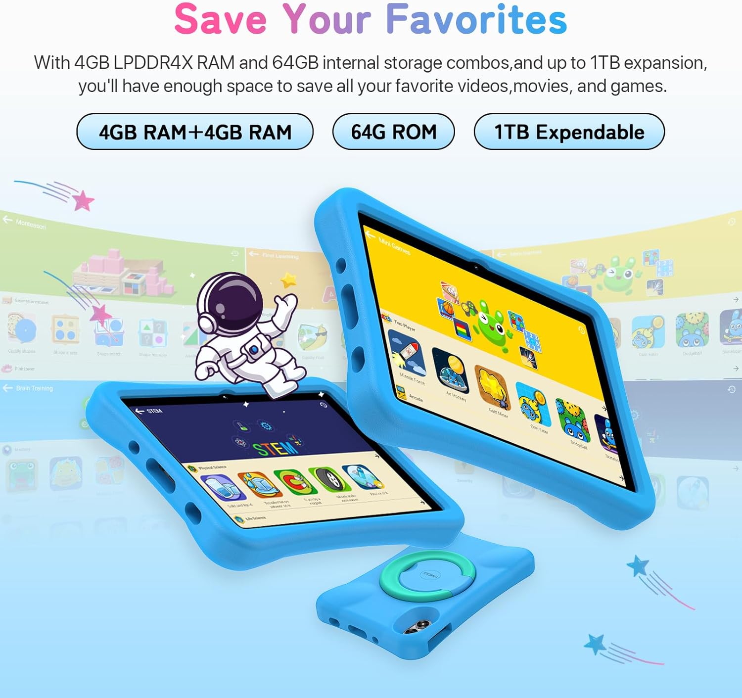 - 【8GB (4+4 expansion) RAM + 64GB ROM + 1TB TF】The G1 Tab Android 13 tablet uses the latest memory expansion technology to dramatically increase the memory running space from 4GB to 8GB, allowing the tablet to open more applications at the same time, and running at maximum efficiency. The Android kids tablet comes with 64GB ROM and up to 1TB of expandable microSD storage for even more space.