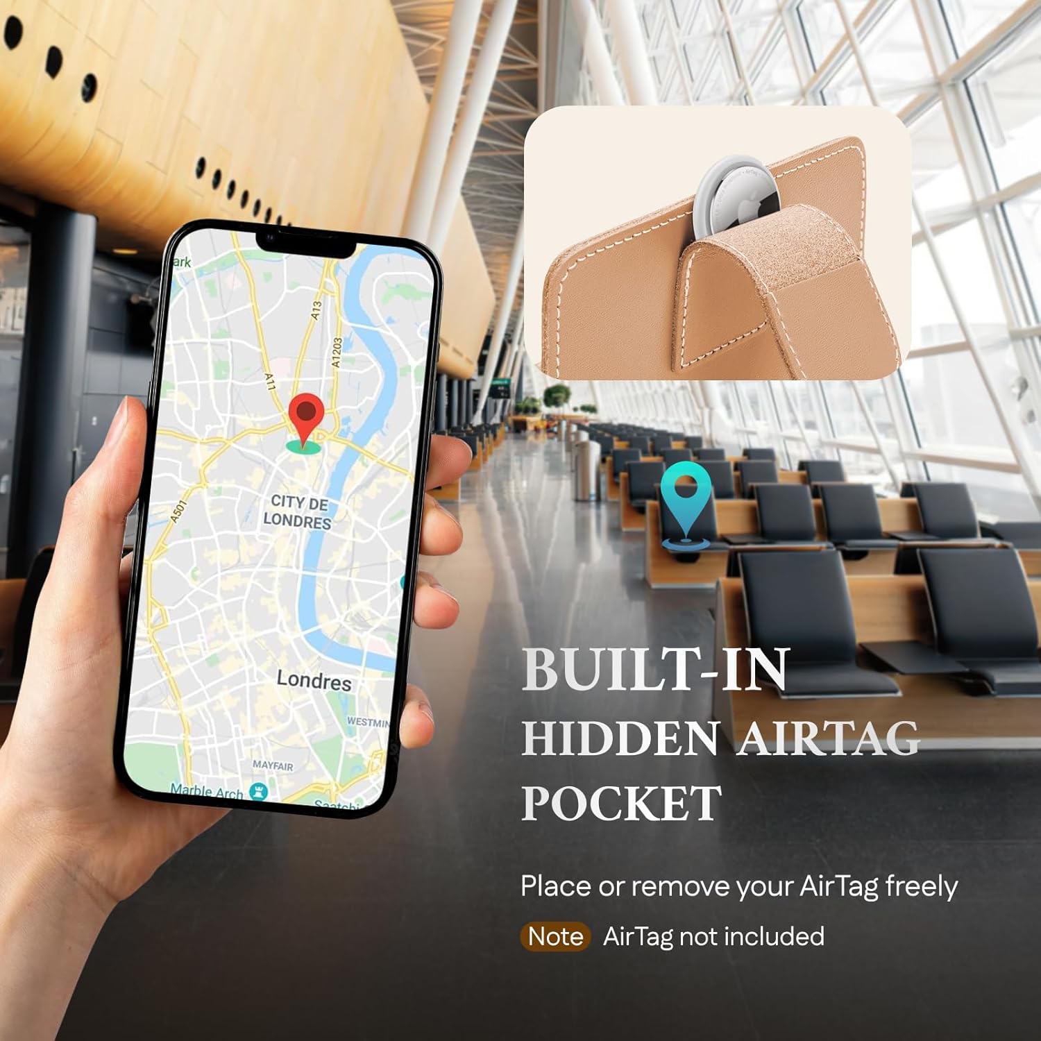 - Hidden AirTag Passport Wallet: This leather passport holder features a hidden pocket on the back of the magnetic closure, designed for an AirTag, allowing you to choose whether to carry it for added security and style. The pocket securely holds the AirTag in place. (AirTag not included.)