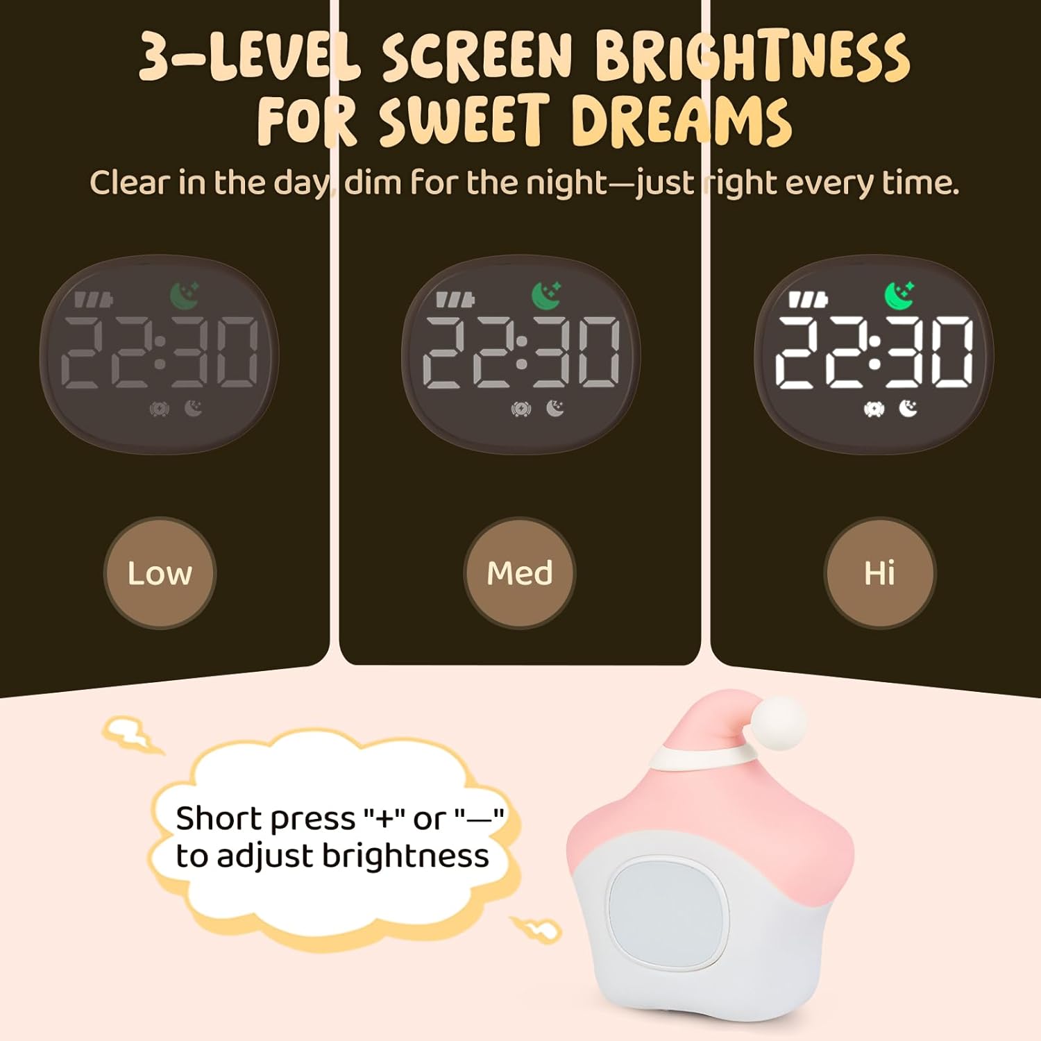 - Snooze & Adjustable Display – Designed for easy use, this kids alarm clock allows a simple tap to snooze for five more minutes, up to three times. Long press any button to turn off the alarm, and adjust the screen brightness to three levels for a comfortable nighttime glow.