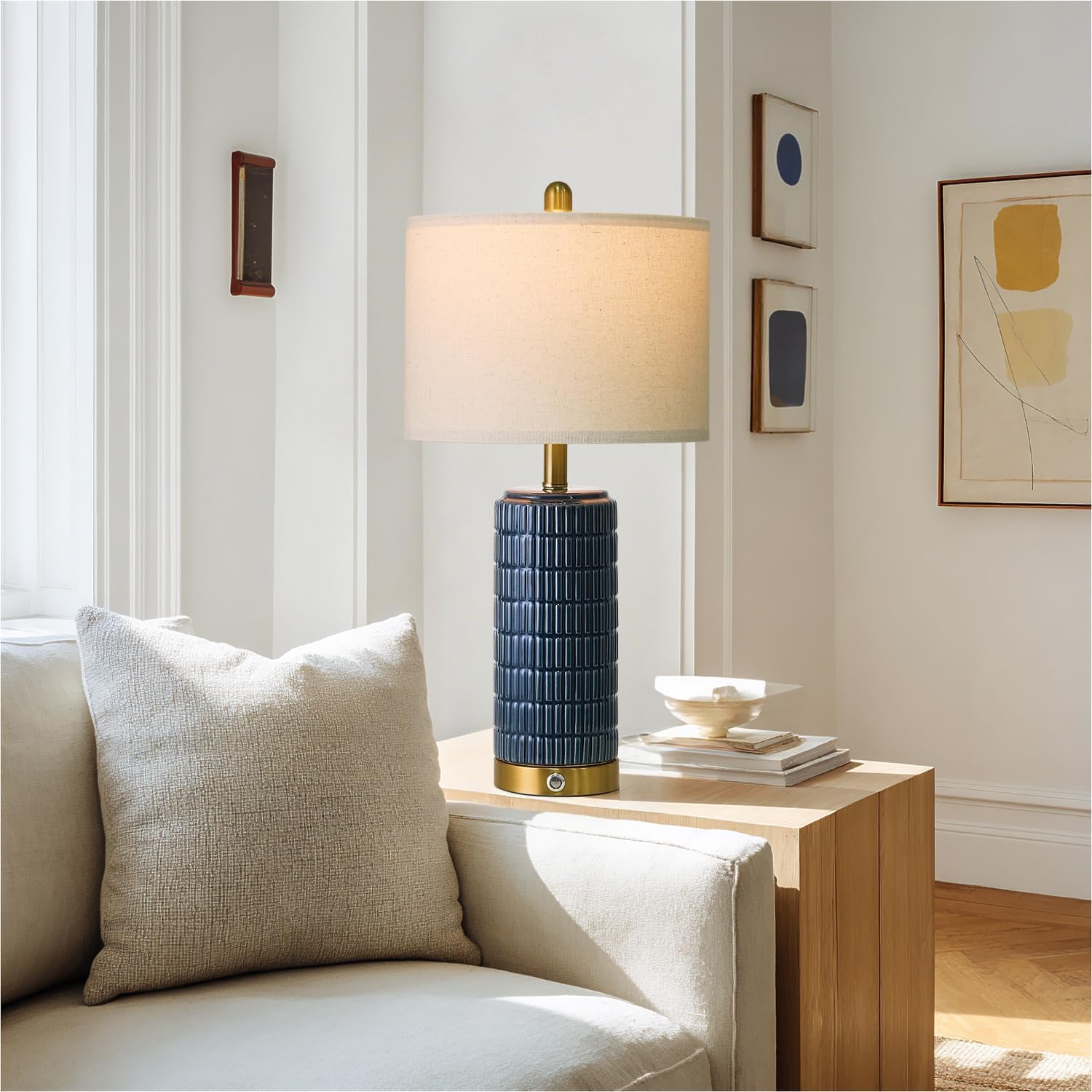 PoKat Touch Bedside Table Lamps with USB Ports for Bedroom, 25'' Dimmable Nightstand Touch Lamps for Living Room, Blue Ceramic Lamps with Gold Base for Night Stands Bedroom, Nursery, Dark Blue