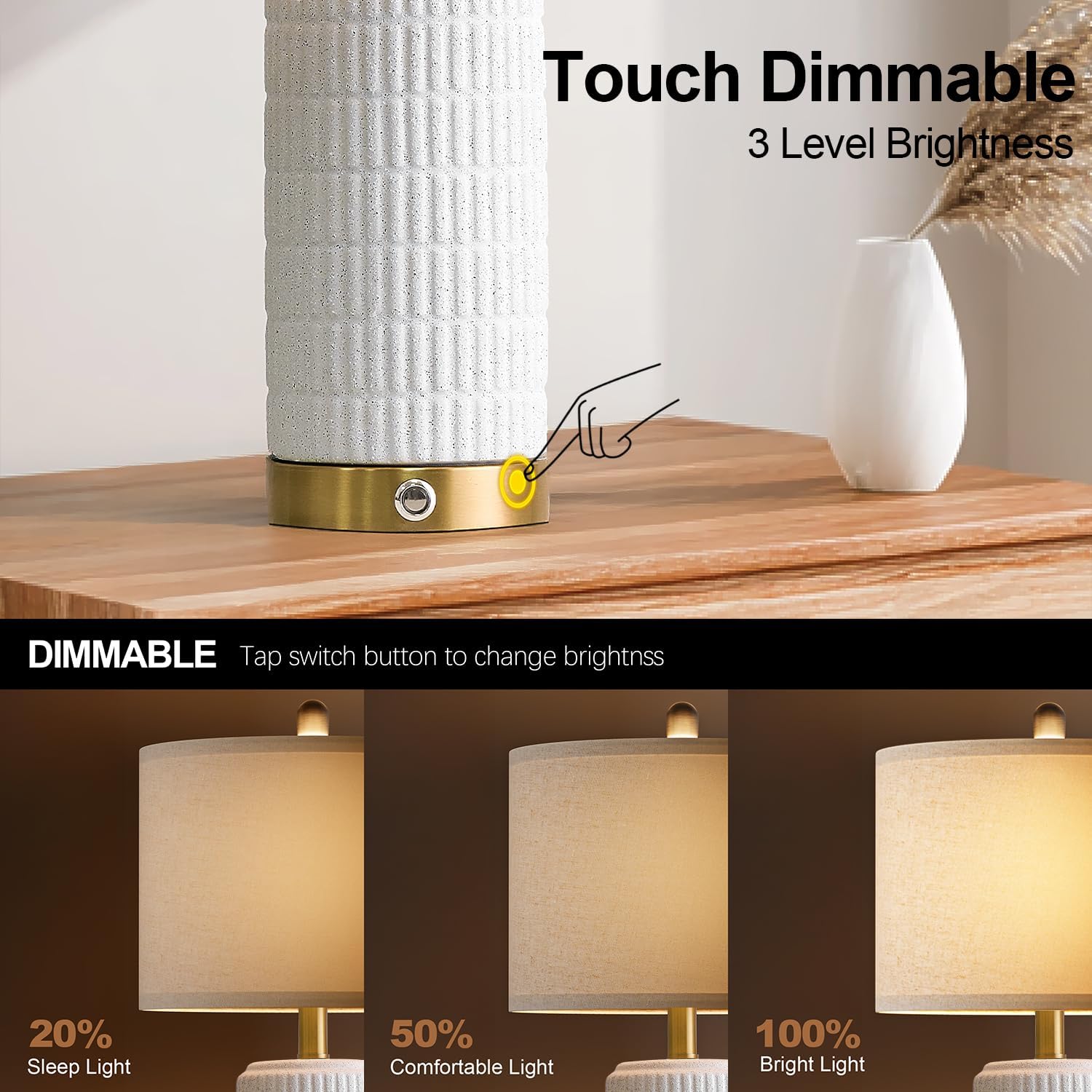 - Touch Control White Lamps: This lamps for living room is equipped with a touch sensor, enabling quick adjustments to 3 distinct brightness levels (Low, Medium, High). Just a gentle touch or pat on the gold base of the lamp for bedroom for nightstands when you wish to turn the dimmable lamps with usb port on/off or make it brighter/dimmer.