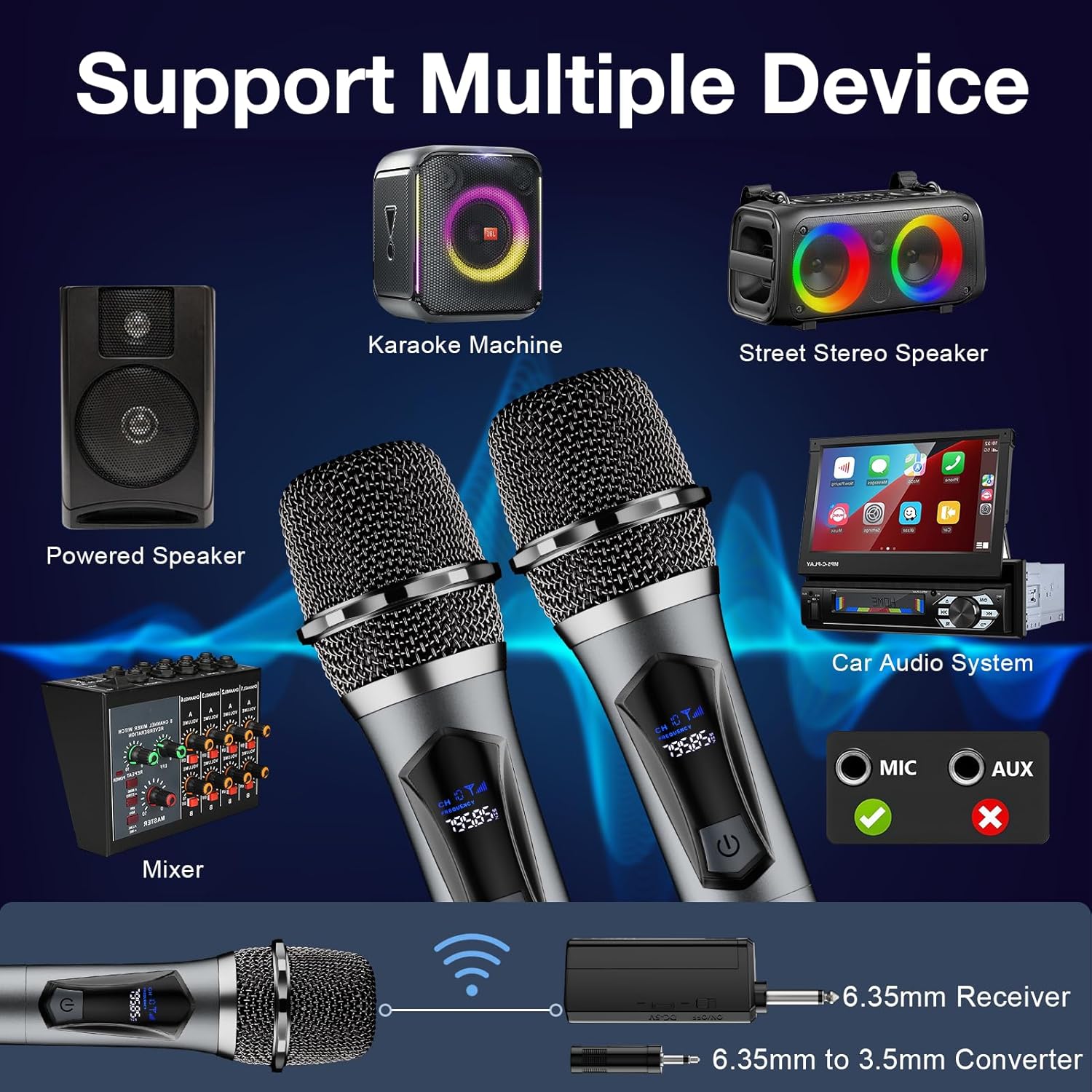 - 【Easy to Plug and Play】Simply plug into equipment with a mic input and pair automatically. Supports 6.35mm and 3.5mm interfaces, making it compatible with mic input speakers, singing machines, audio amplifiers, PA systems, mixers, voice amplifiers, and other streaming multimedia equipment. Note: This microphone is not compatible with Bluetooth or AUX port connections.