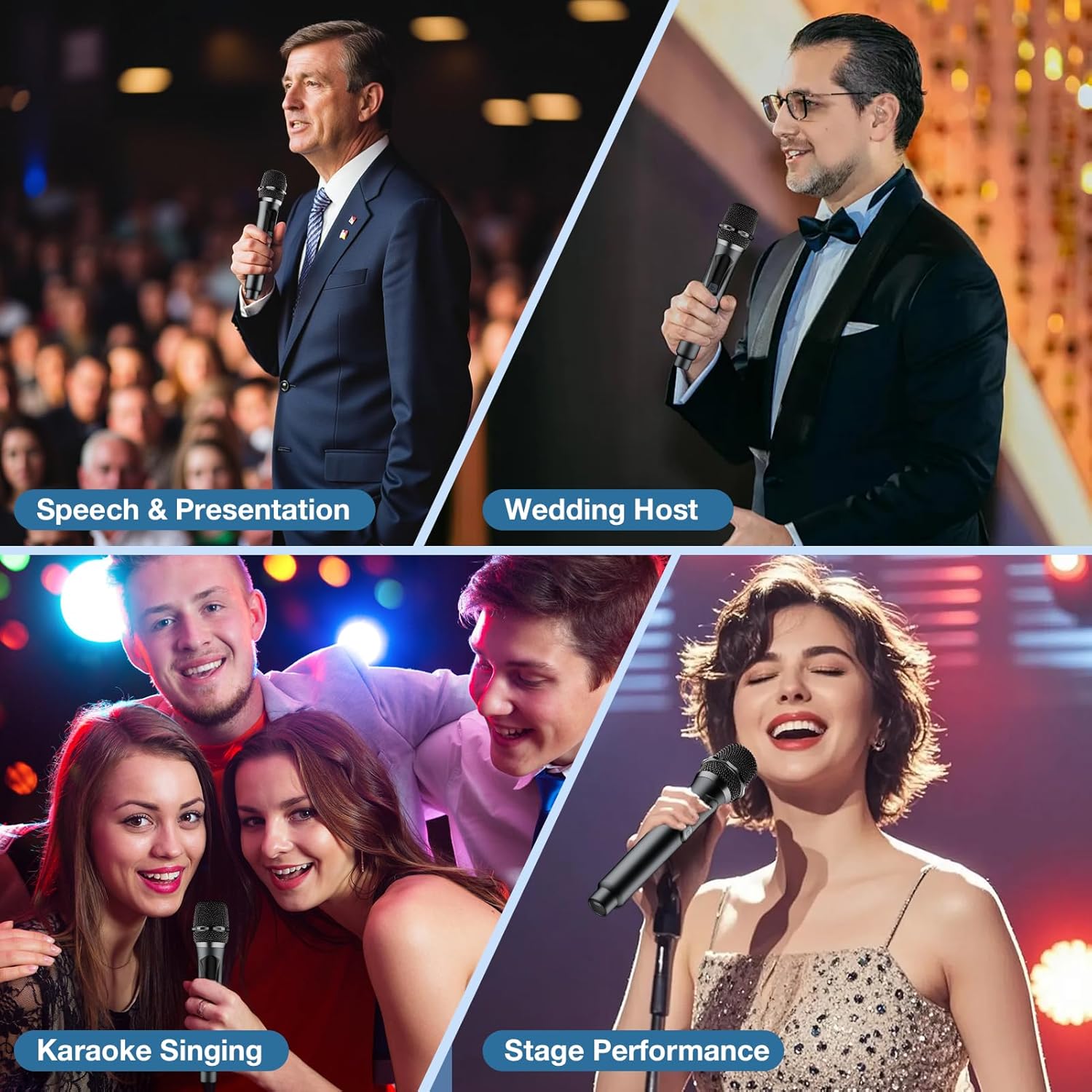 - 【Wireless Freedom】160ft operating range (line of sight) allows you to freely move around during performances. The upgraded chip ensures stable reception, with no delay and no noise, suitable for indoor and outdoor activities such as home karaoke, church, weddings, conferences, speeches and small stage performances.