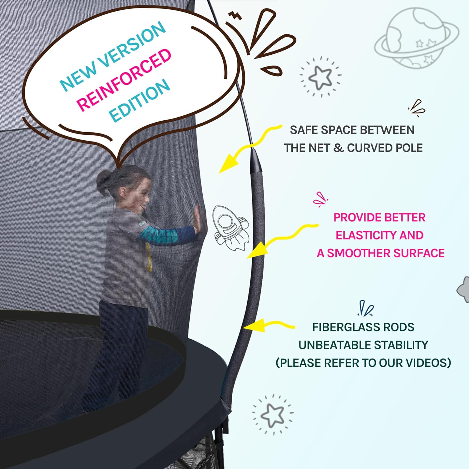 - [ Patented Fiberglass Rods, UNBEATABLE STABILITY! ]: Fiberglass material is more durable and flexible compared to traditional metal poles and it does not rust, which means the poles will not corrode over time. Many injuries are preventable!