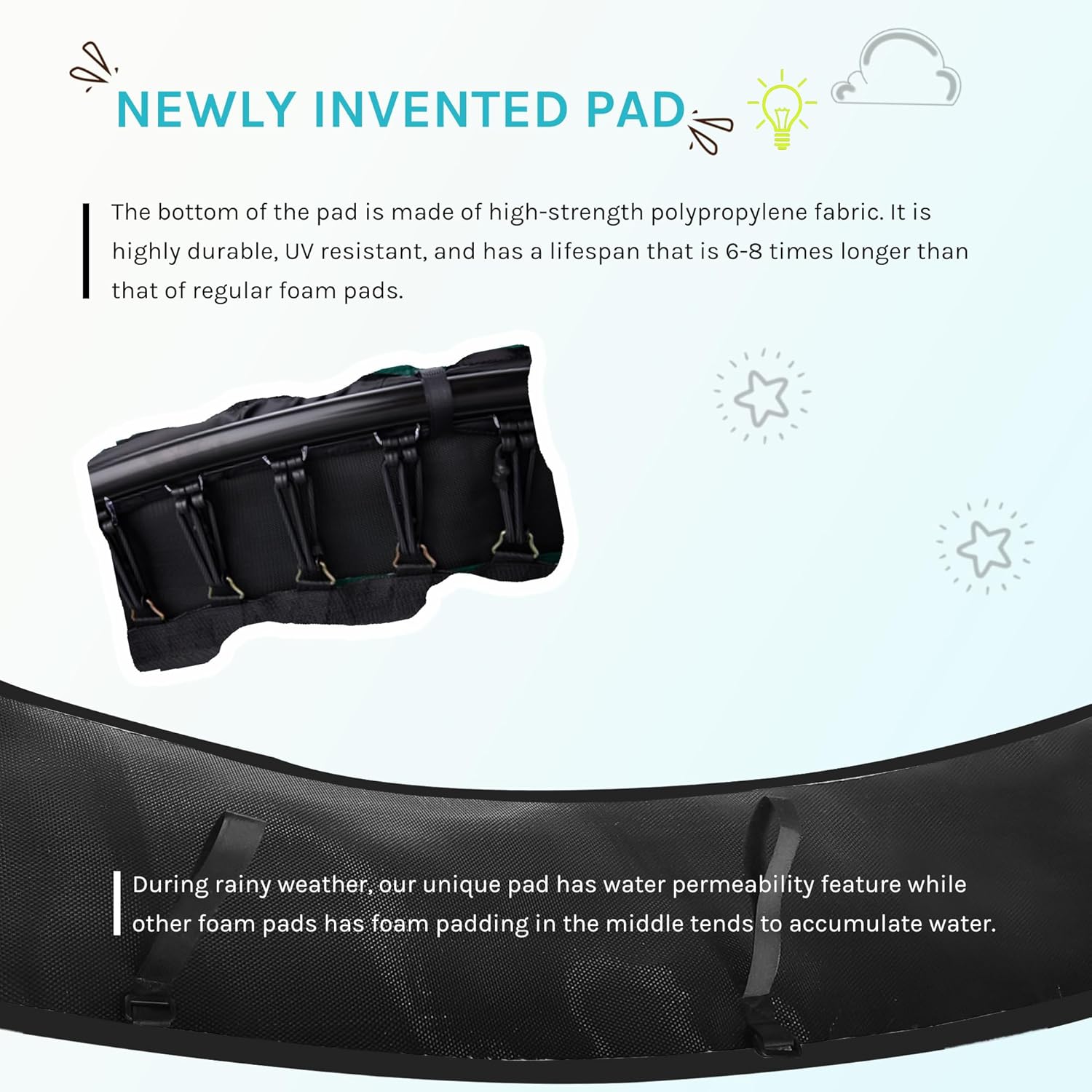 - [ Newly Designed Pad, HIGH-STRENGTH POLYPROPYLENE! ]: Highly durable, UV resistant, water-permeable and has a lifespan that is 6-8 times longer than that of regular foam pads. The pad is sewn with high-quality straps at the bottom, tightly wrapping around the frame to prevent loosening.